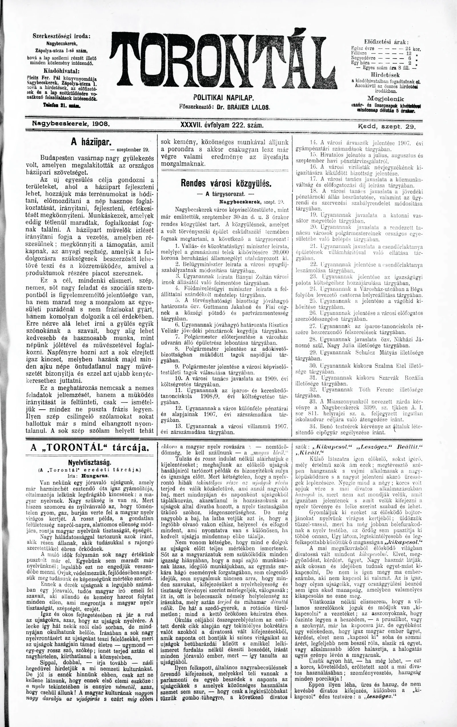 Torontál, 37. évf. 1908. szeptember 29. 222. sz.