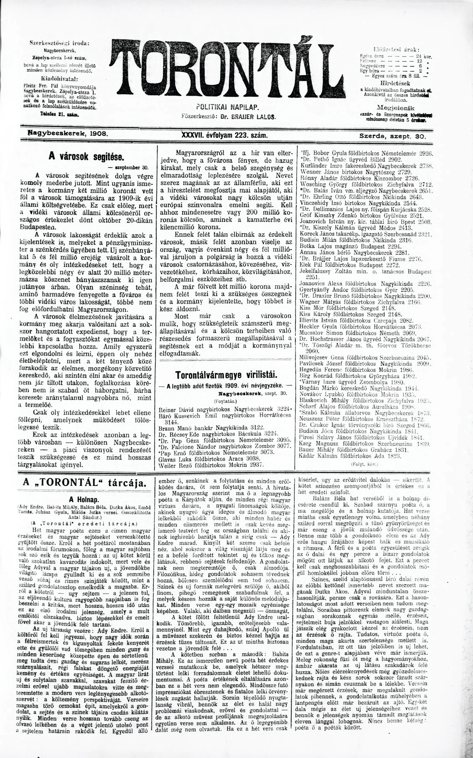 Torontál, 37. évf. 1908. szeptember 30. 223. sz.