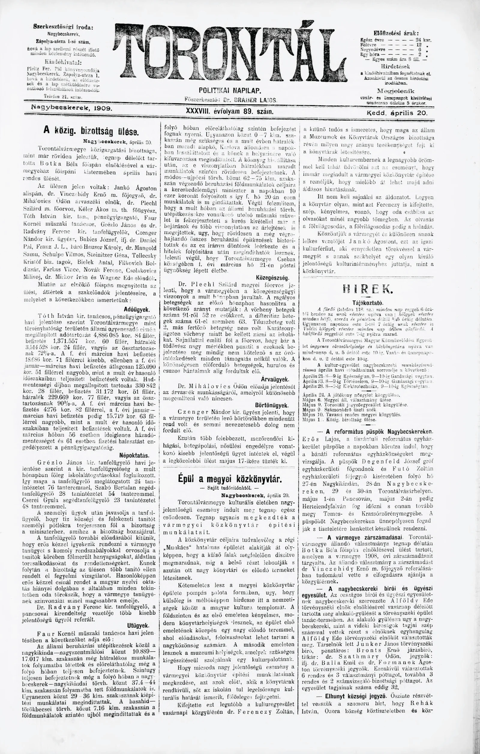 Torontál, 38. évf. 1909. április 20. 89. sz.