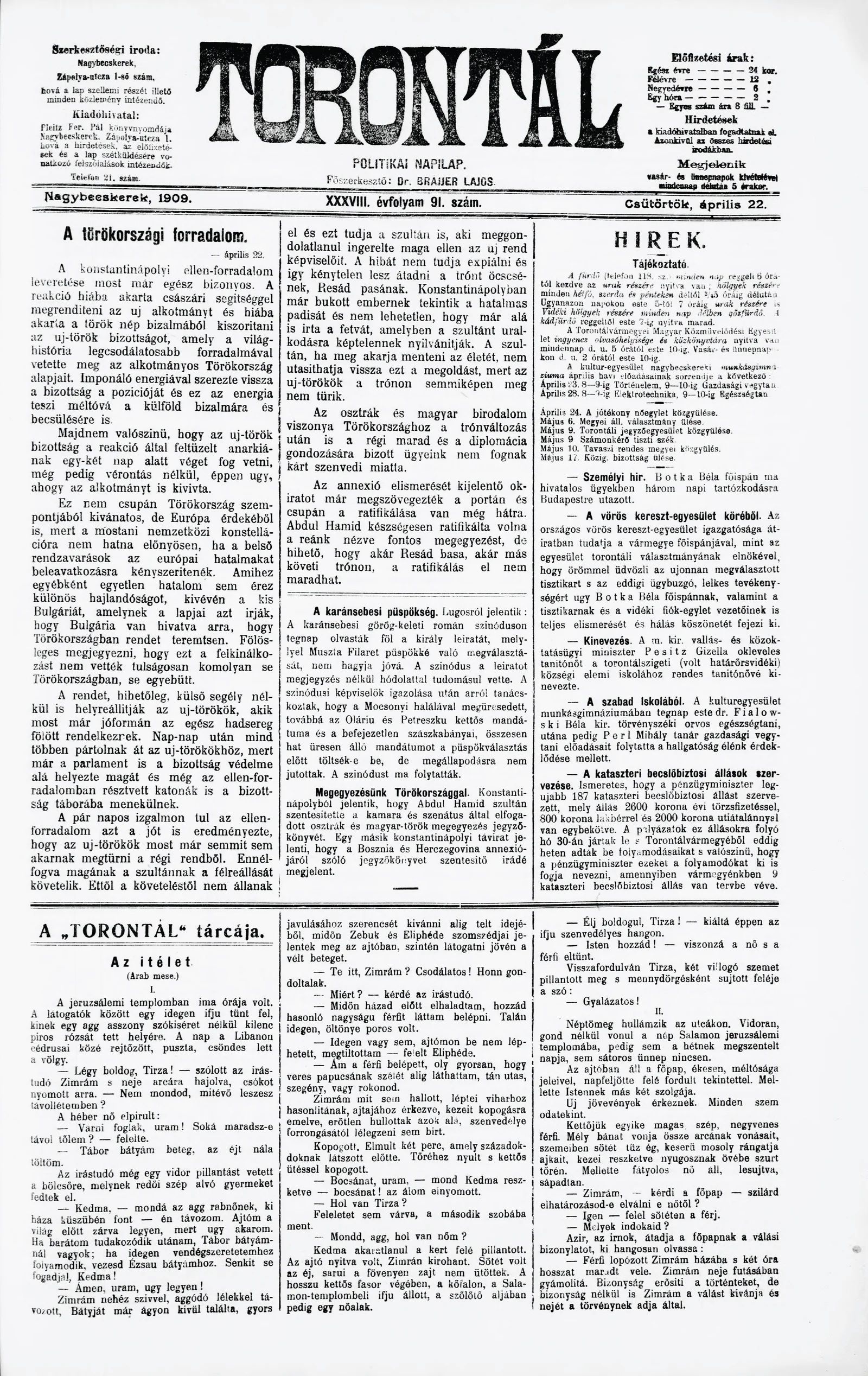 Torontál, 38. évf. 1909. április 22. 91. sz.