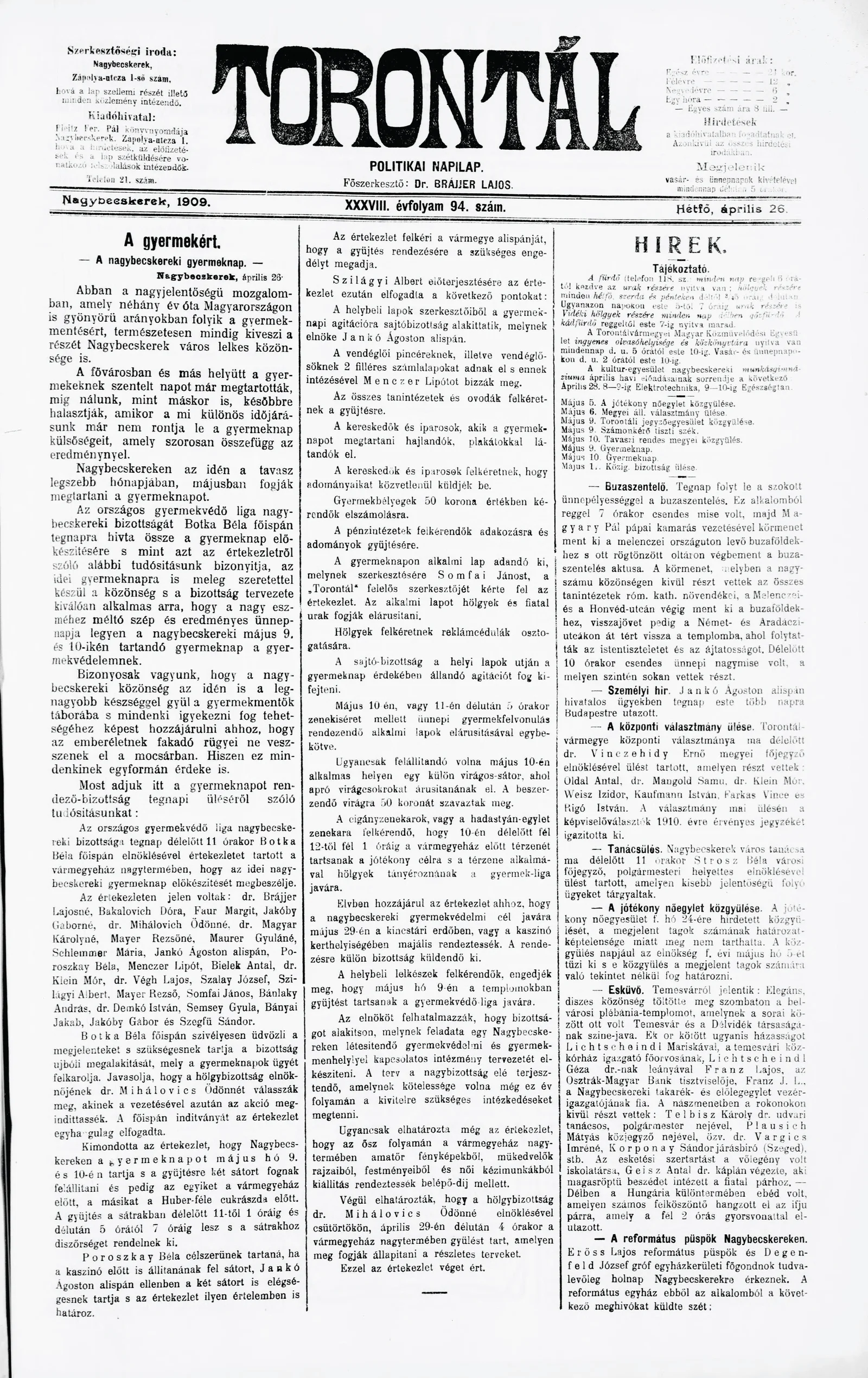 Torontál, 38. évf. 1909. április 26. 94. sz.