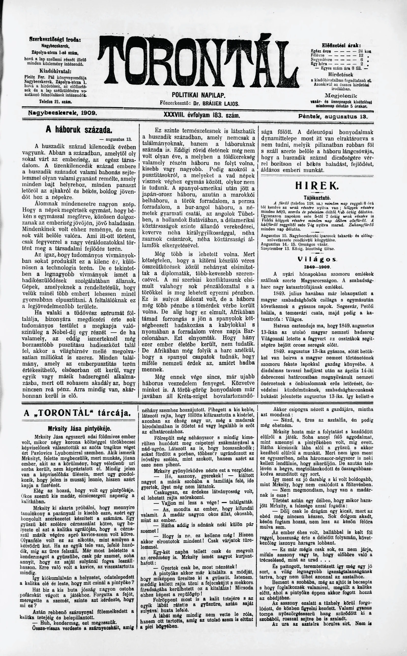 Torontál, 38. évf. 1909. augusztus 13. 183. sz.