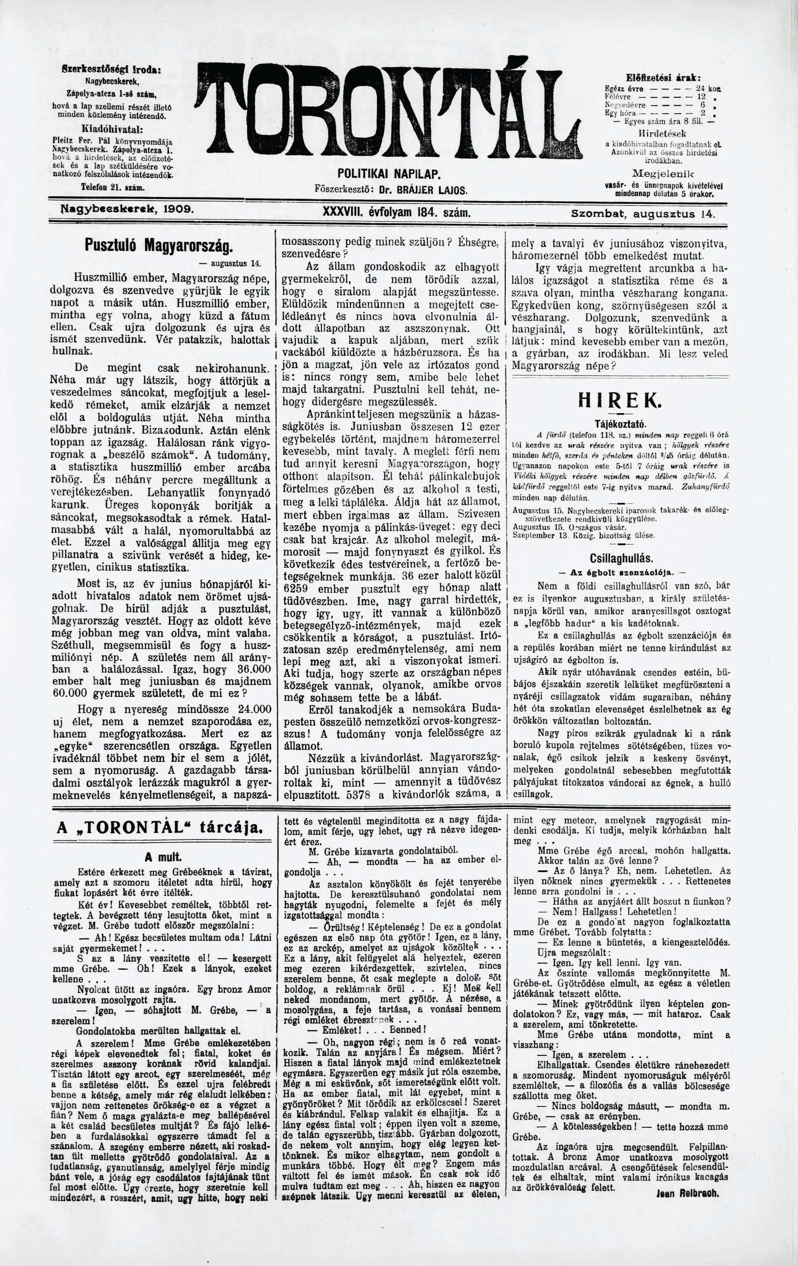 Torontál, 38. évf. 1909. augusztus 14. 184. sz.
