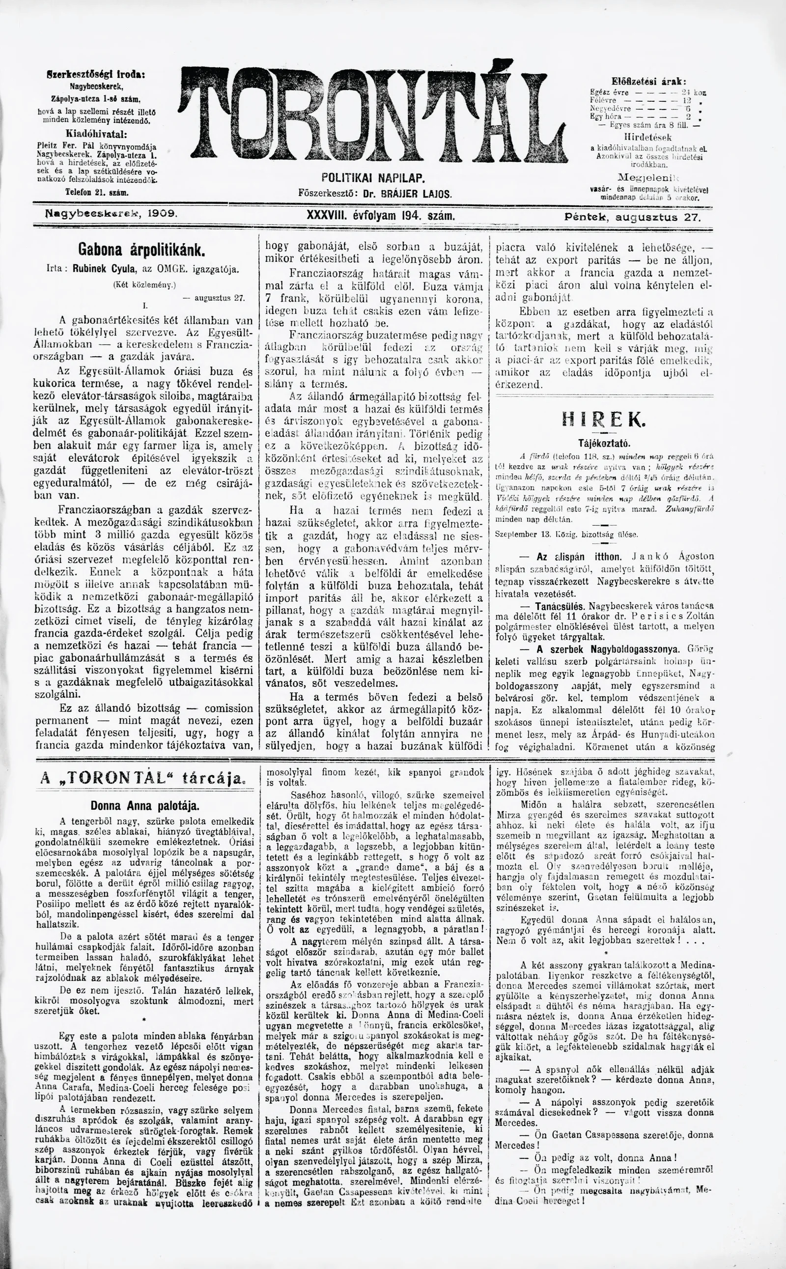 Torontál, 38. évf. 1909. augusztus 27. 194. sz.