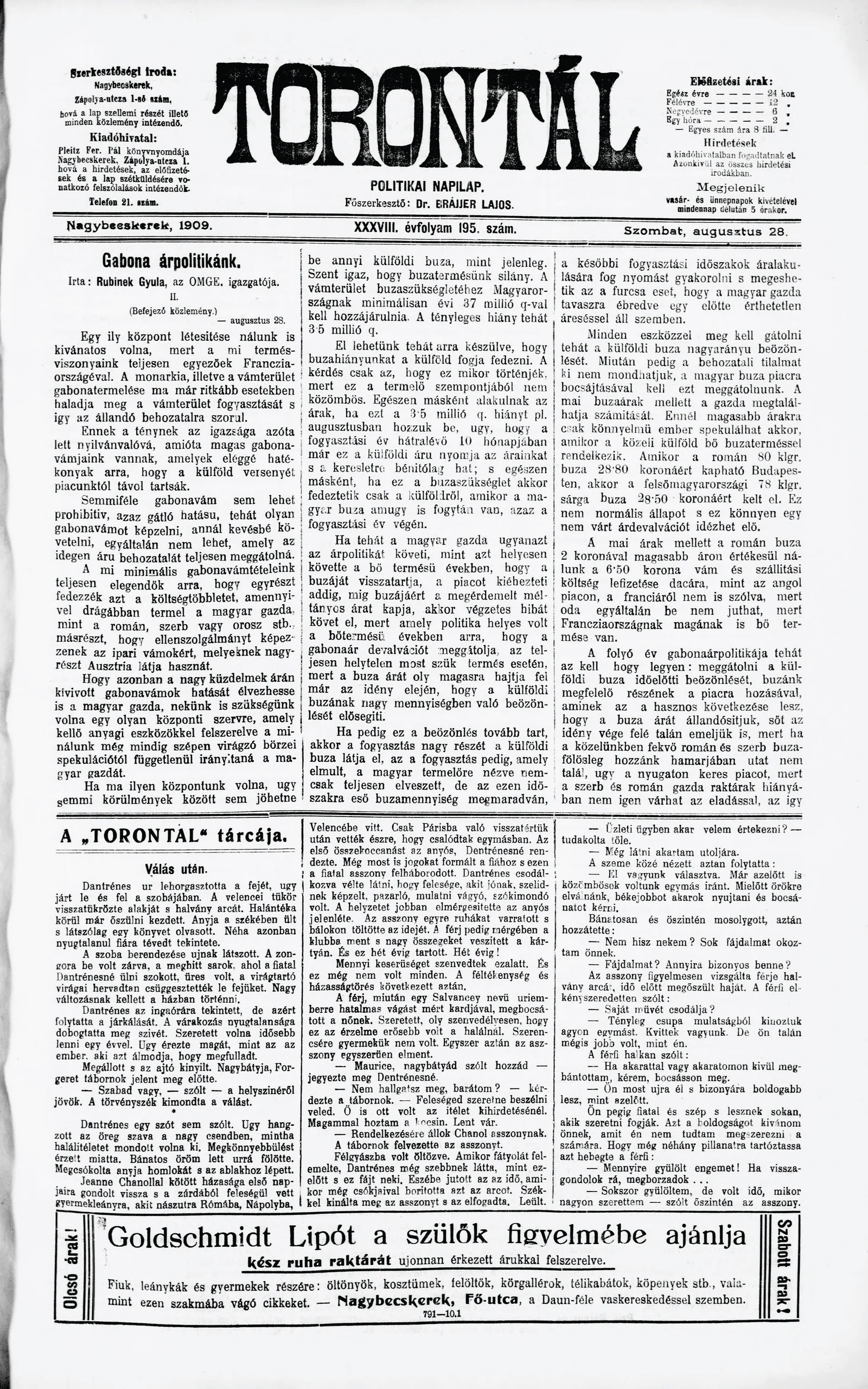 Torontál, 38. évf. 1909. augusztus 28. 195. sz.