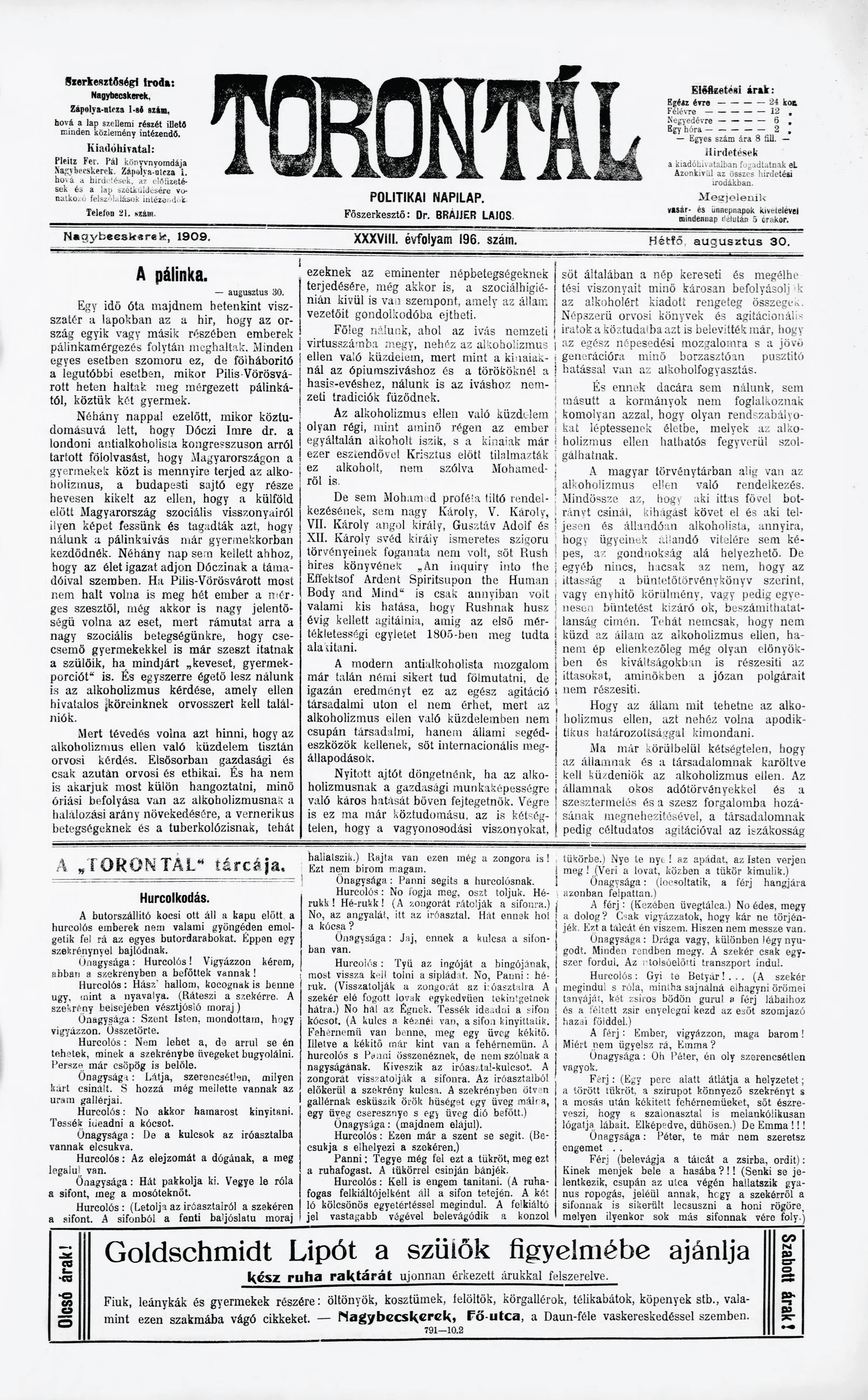 Torontál, 38. évf. 1909. augusztus 30. 196. sz.