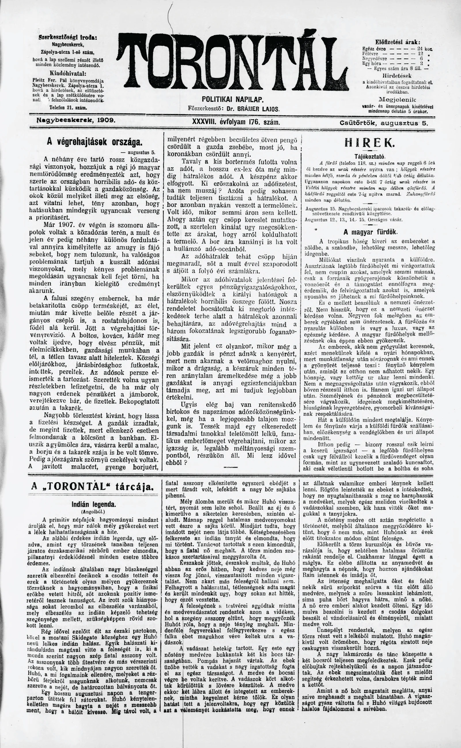 Torontál, 38. évf. 1909. augusztus 5. 176. sz.
