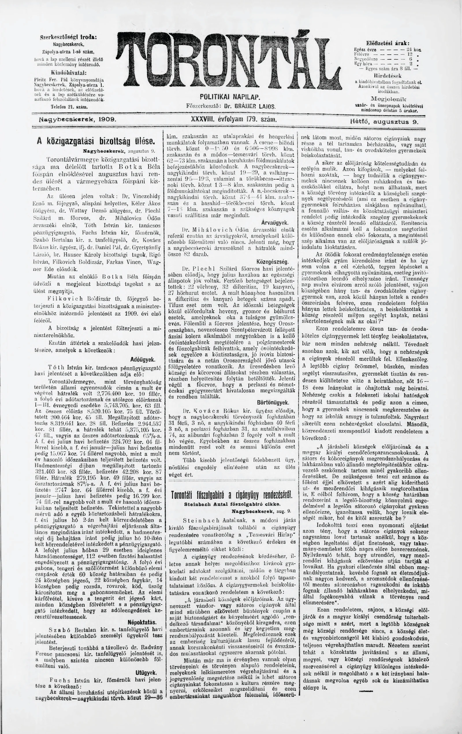 Torontál, 38. évf. 1909. augusztus 9. 179. sz.