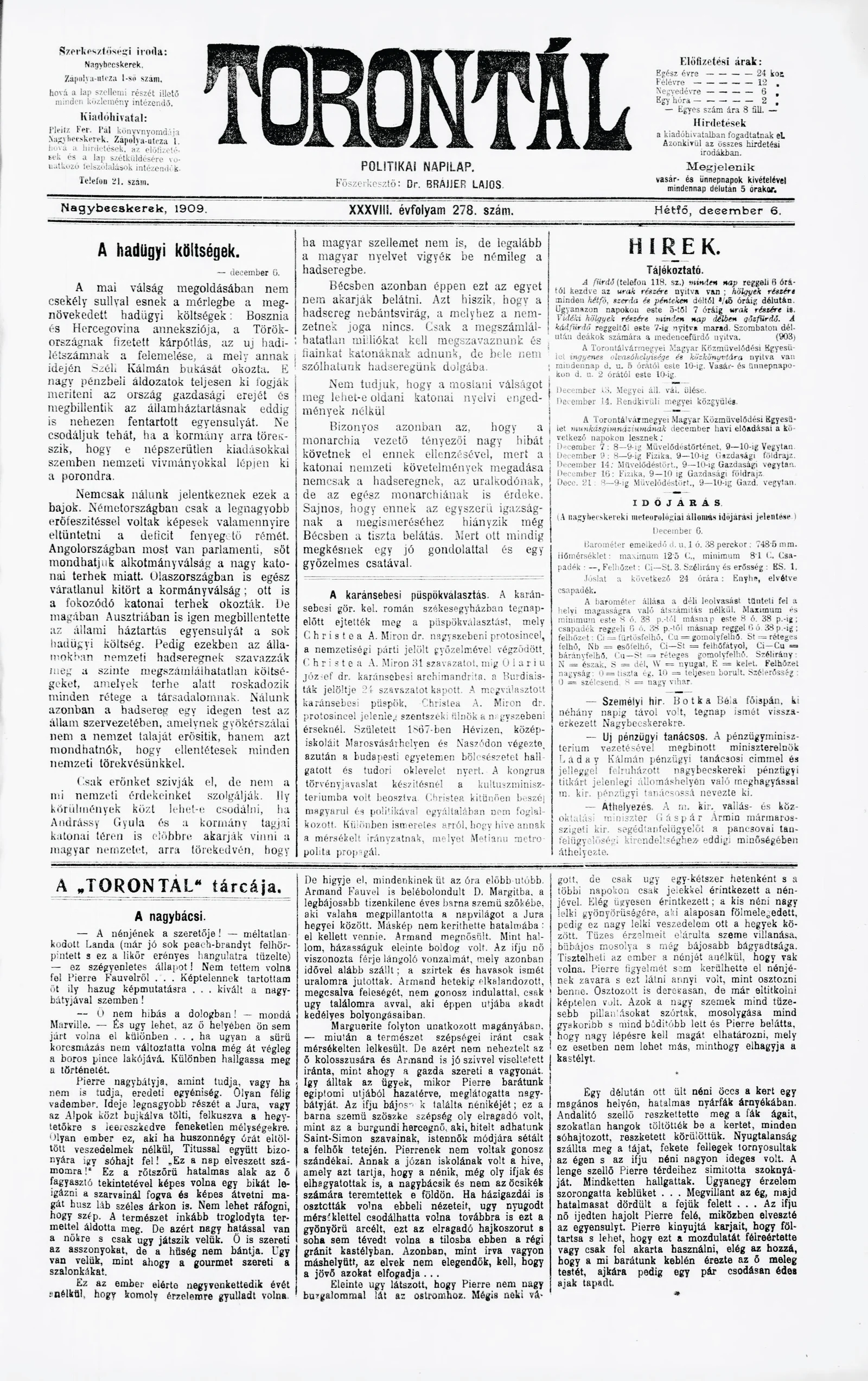 Torontál, 38. évf. 1909. december 6. 278. sz.