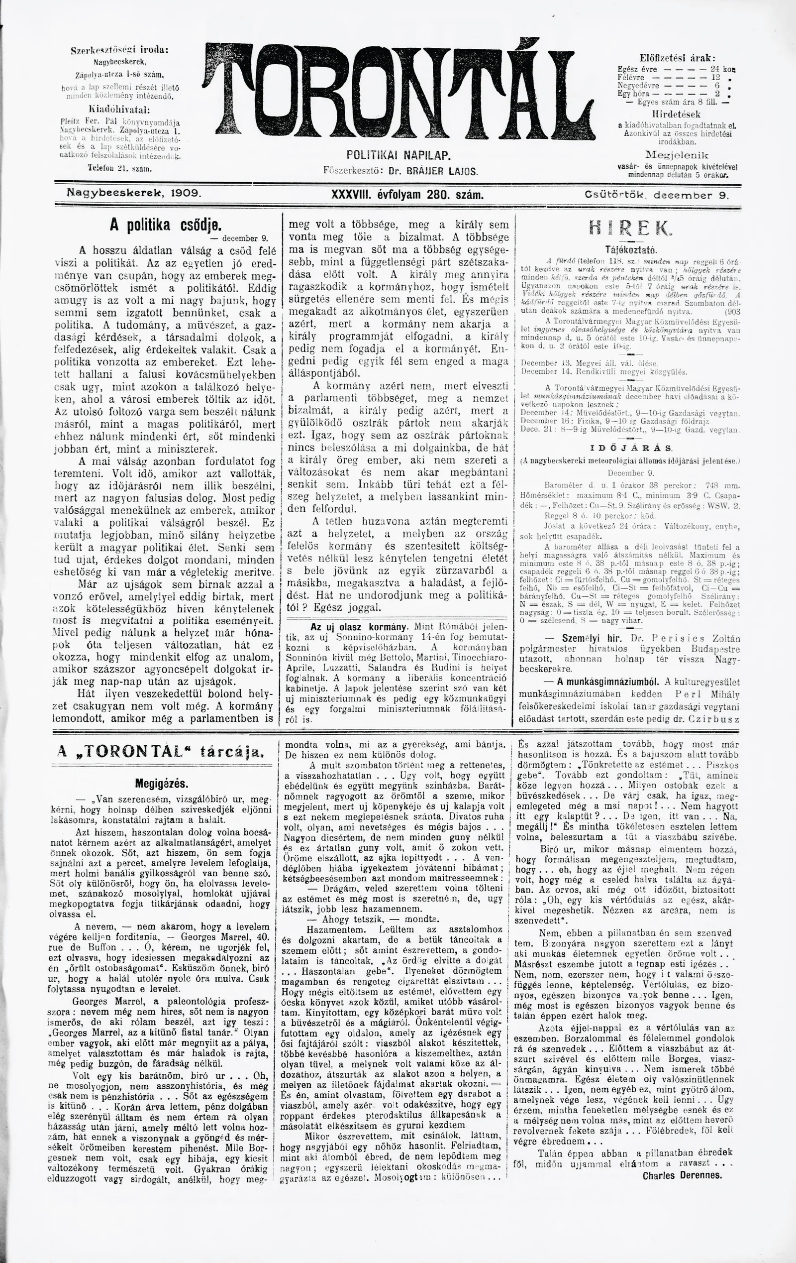 Torontál, 38. évf. 1909. december 9. 280. sz.