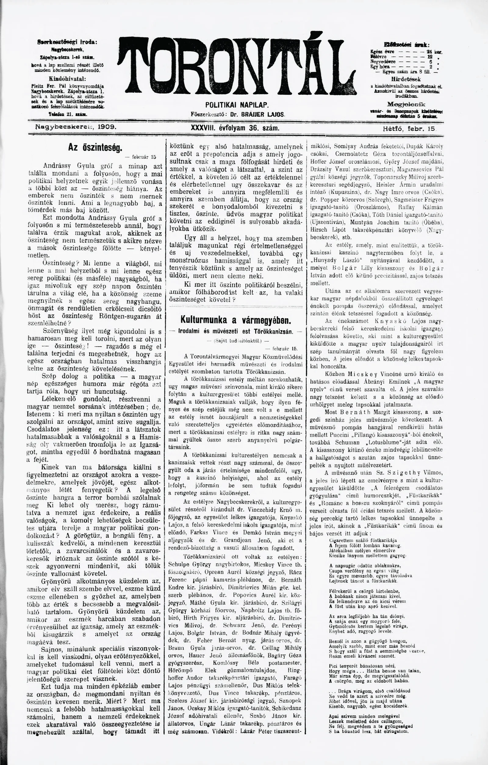 Torontál, 38. évf. 1909. február 15. 36. sz.