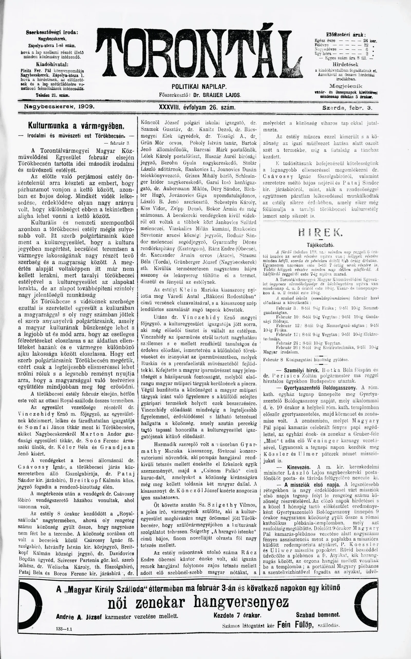 Torontál, 38. évf. 1909. február 3. 26. sz.