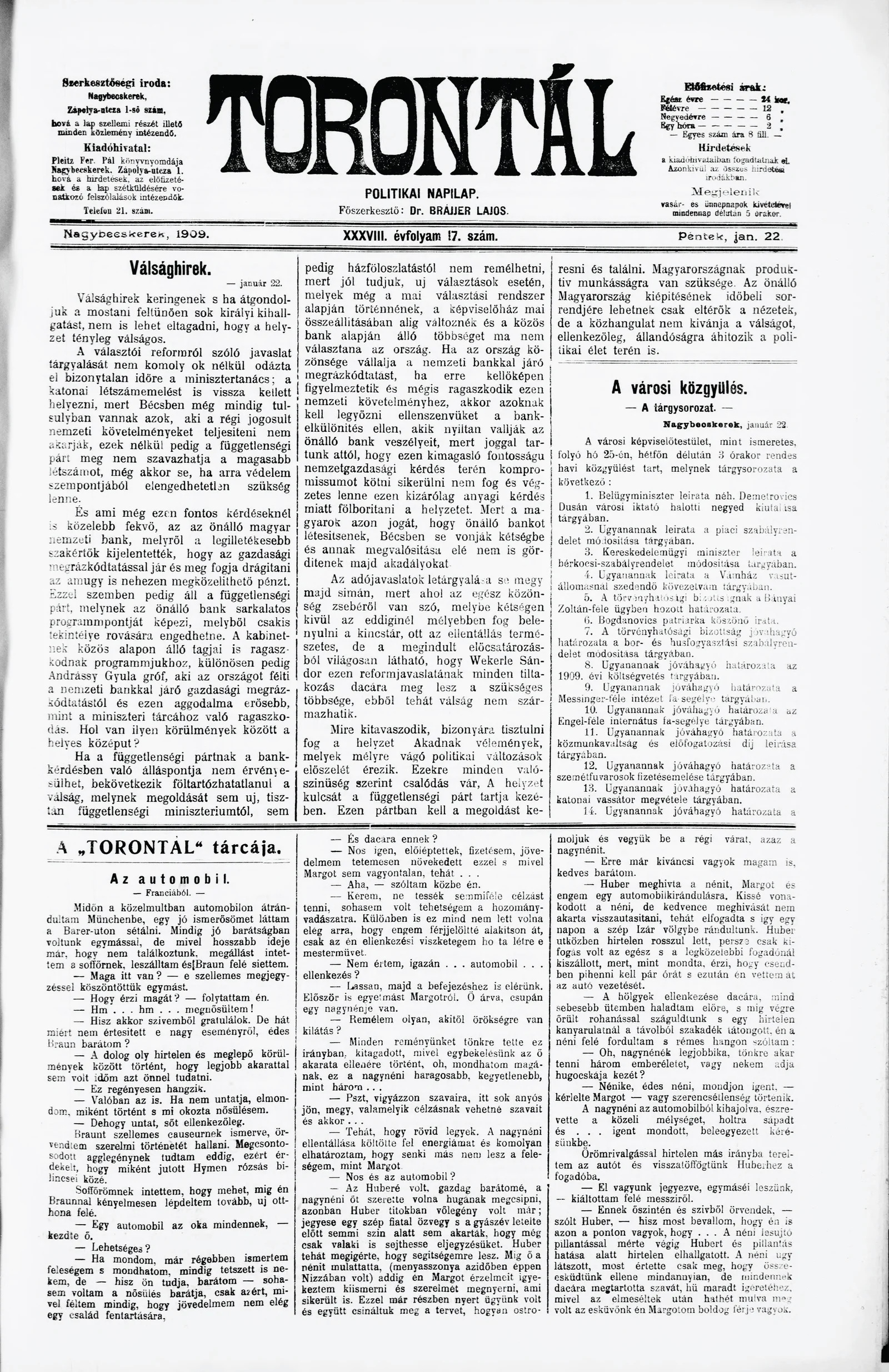 Torontál, 38. évf. 1909. január 22. 17. sz.