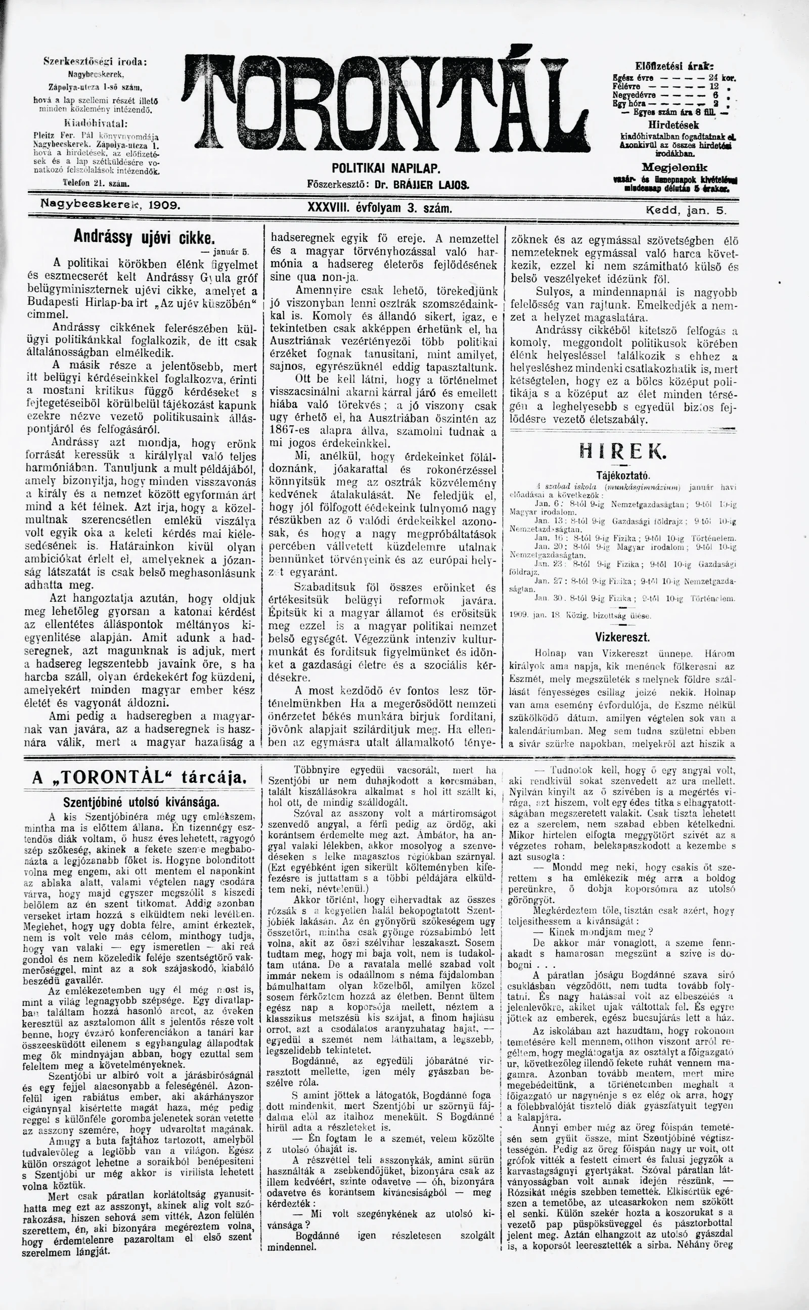 Torontál, 38. évf. 1909. január 5. 3. sz.