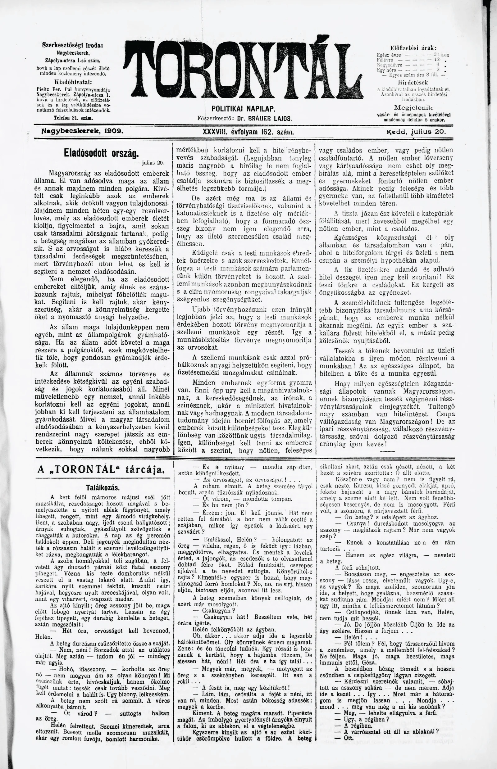 Torontál, 38. évf. 1909. július 20. 162. sz.