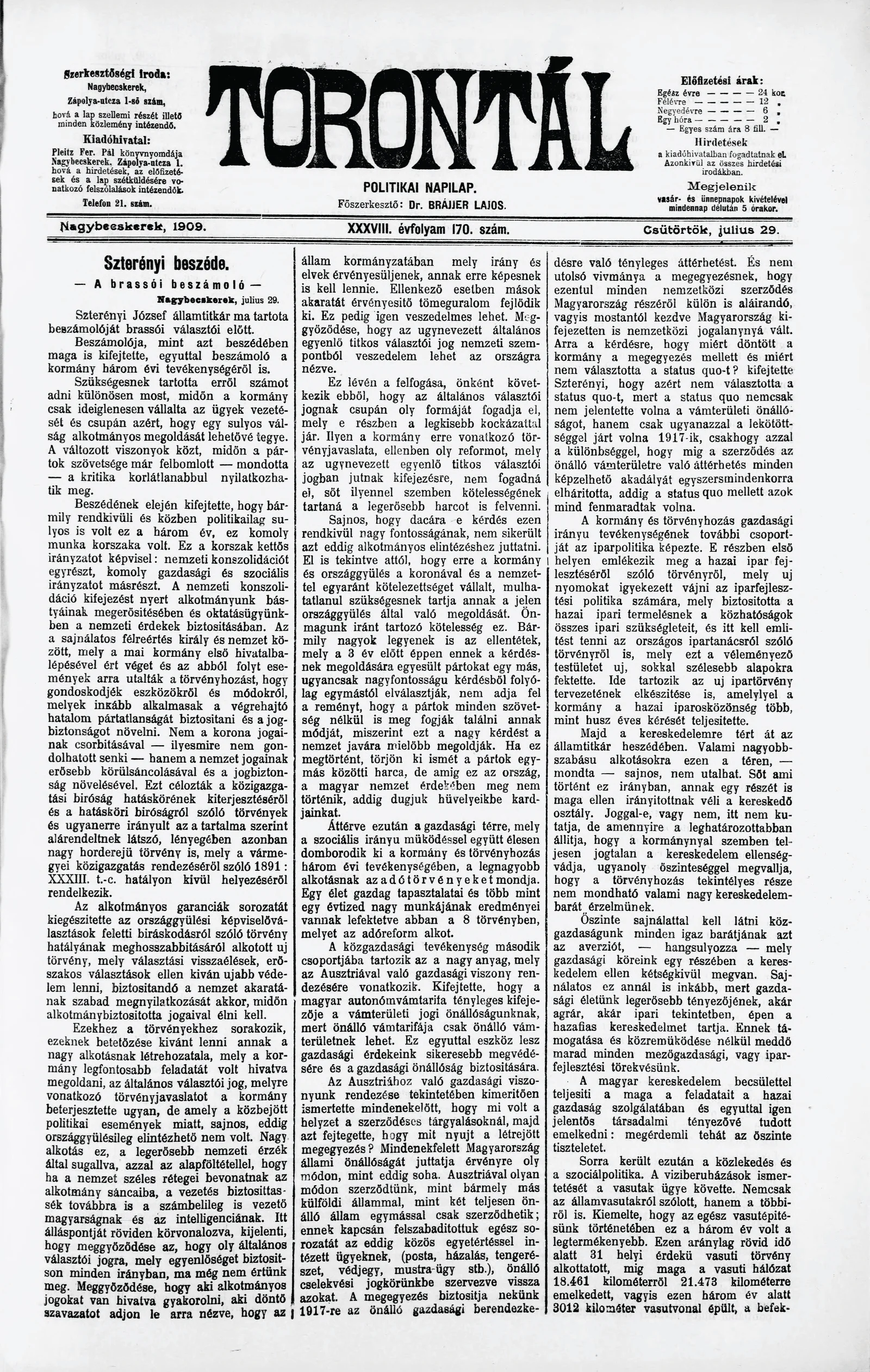 Torontál, 38. évf. 1909. július 29. 170. sz.