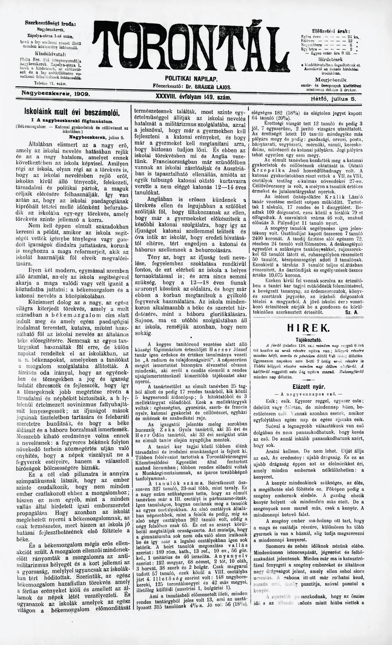 Torontál, 38. évf. 1909. július 5. 149. sz.