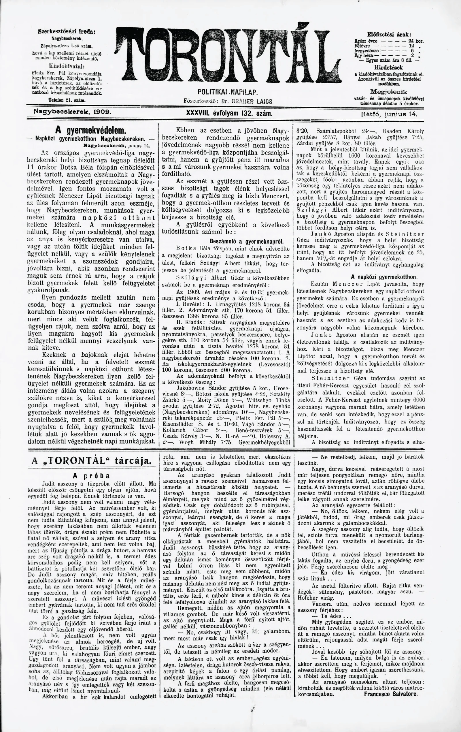 Torontál, 38. évf. 1909. június 14. 132. sz.