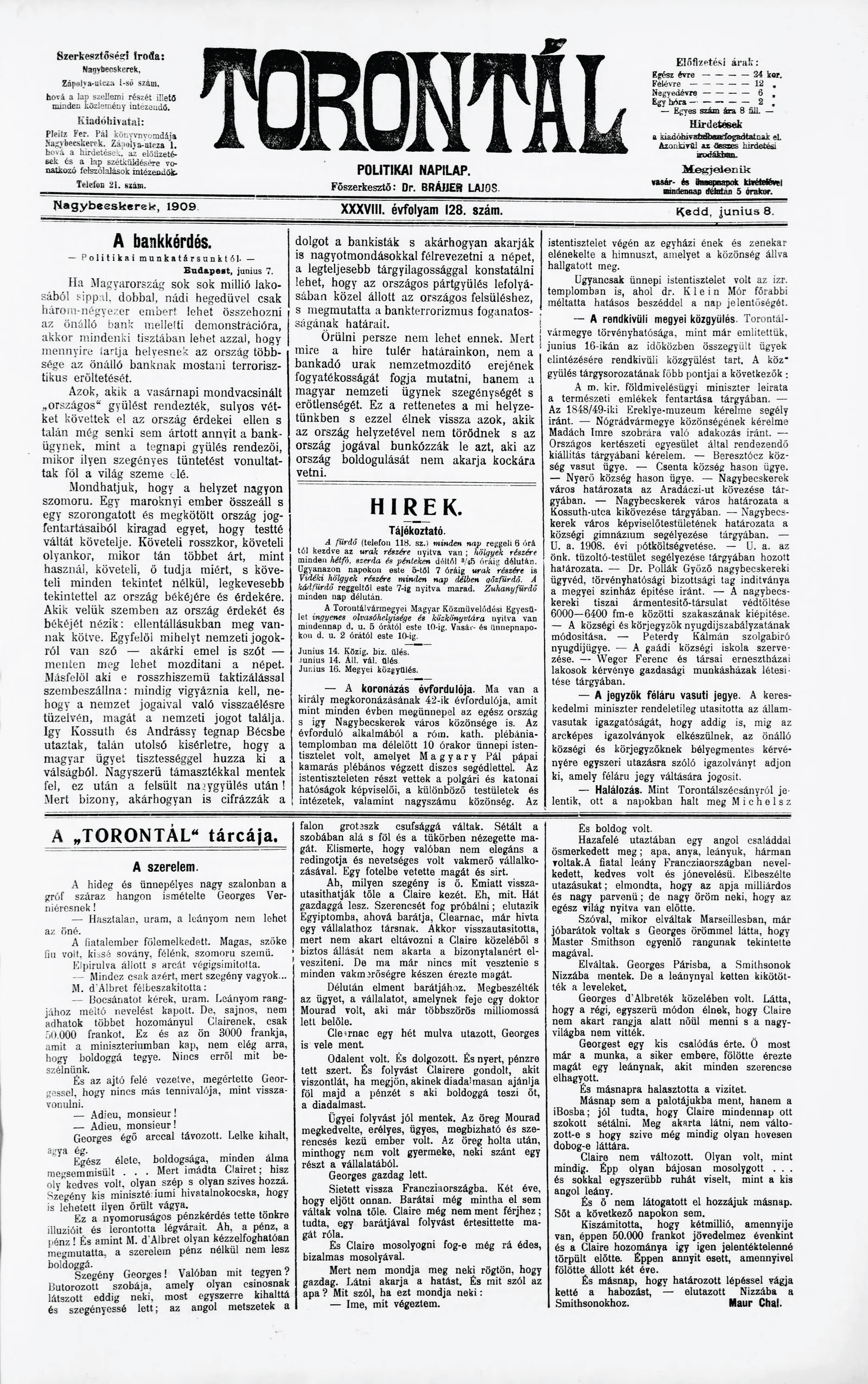 Torontál, 38. évf. 1909. június 8. 128. sz.