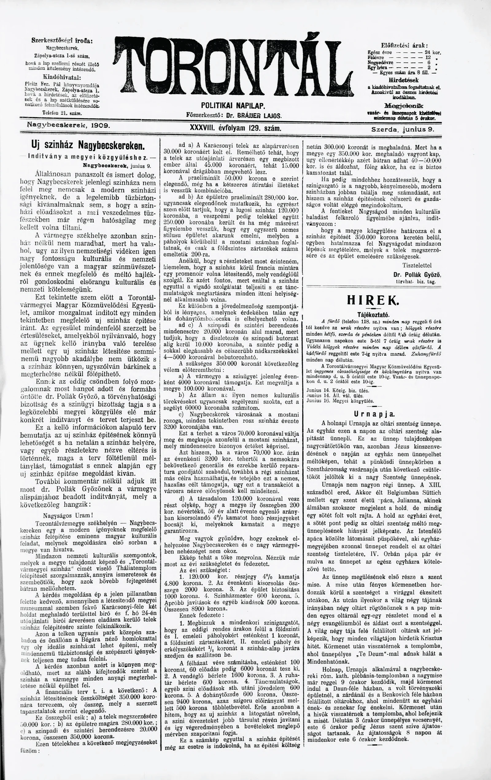Torontál, 38. évf. 1909. június 9. 129. sz.