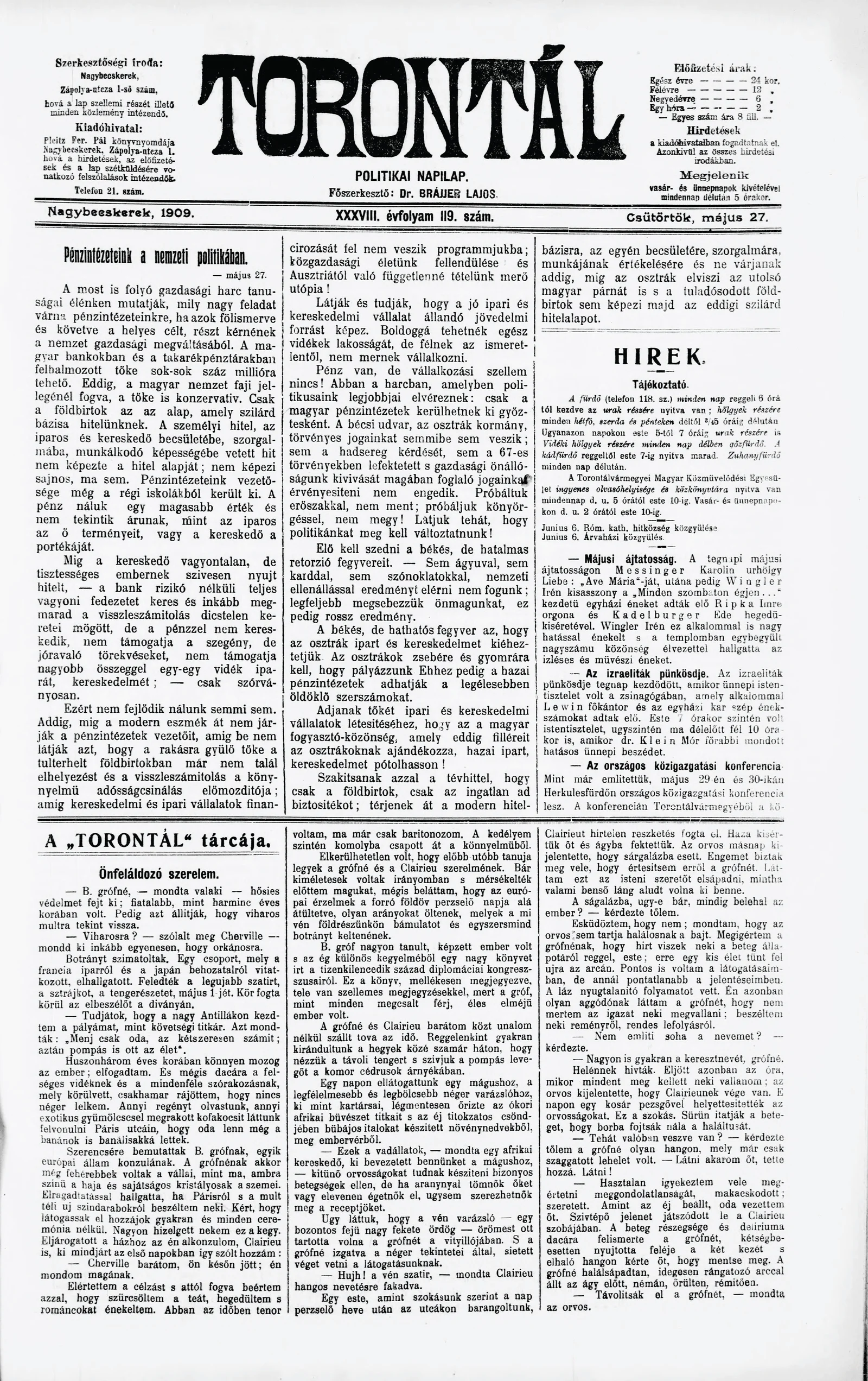 Torontál, 38. évf. 1909. május 27. 119. sz.