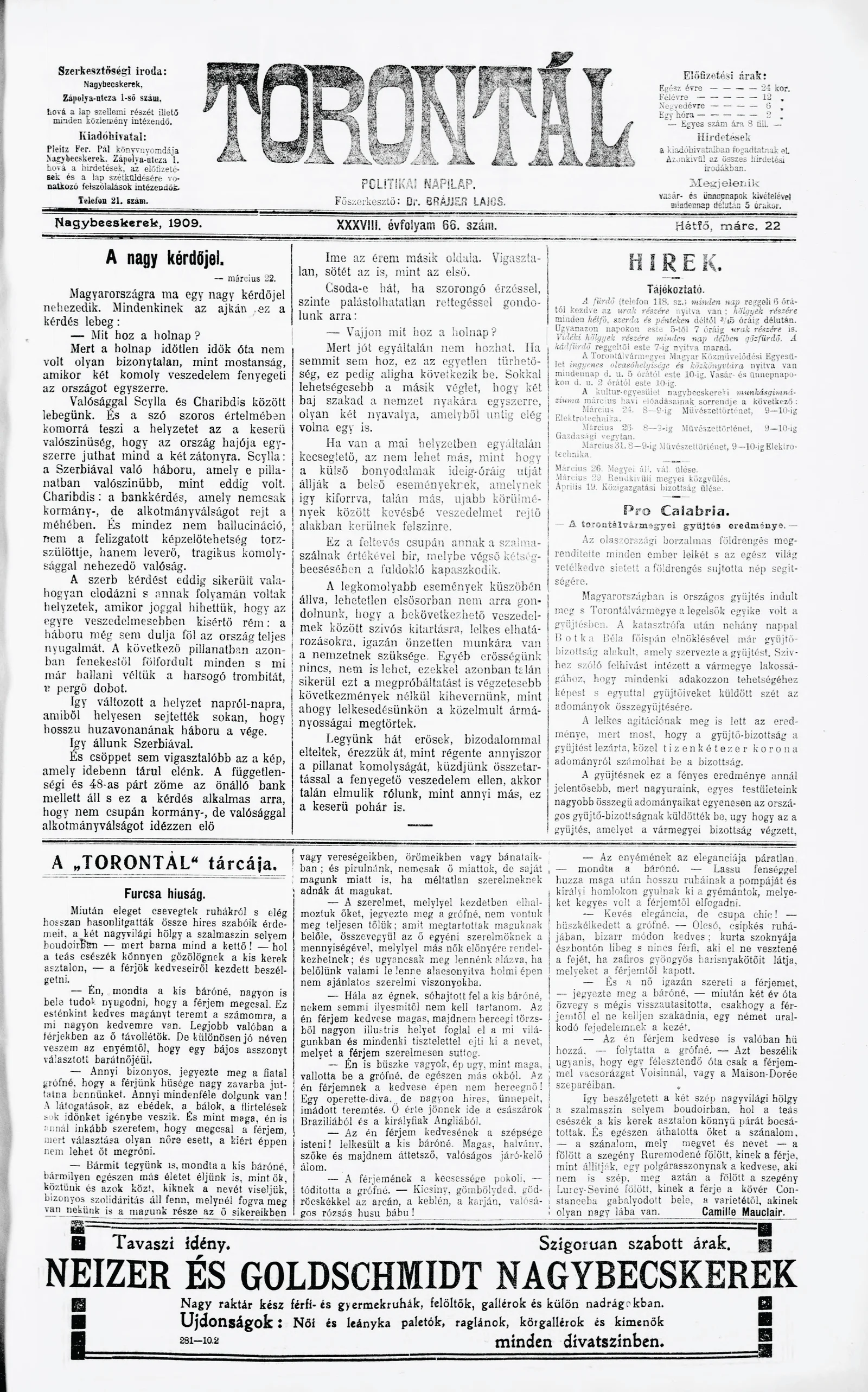 Torontál, 38. évf. 1909. március 22. 66. sz.