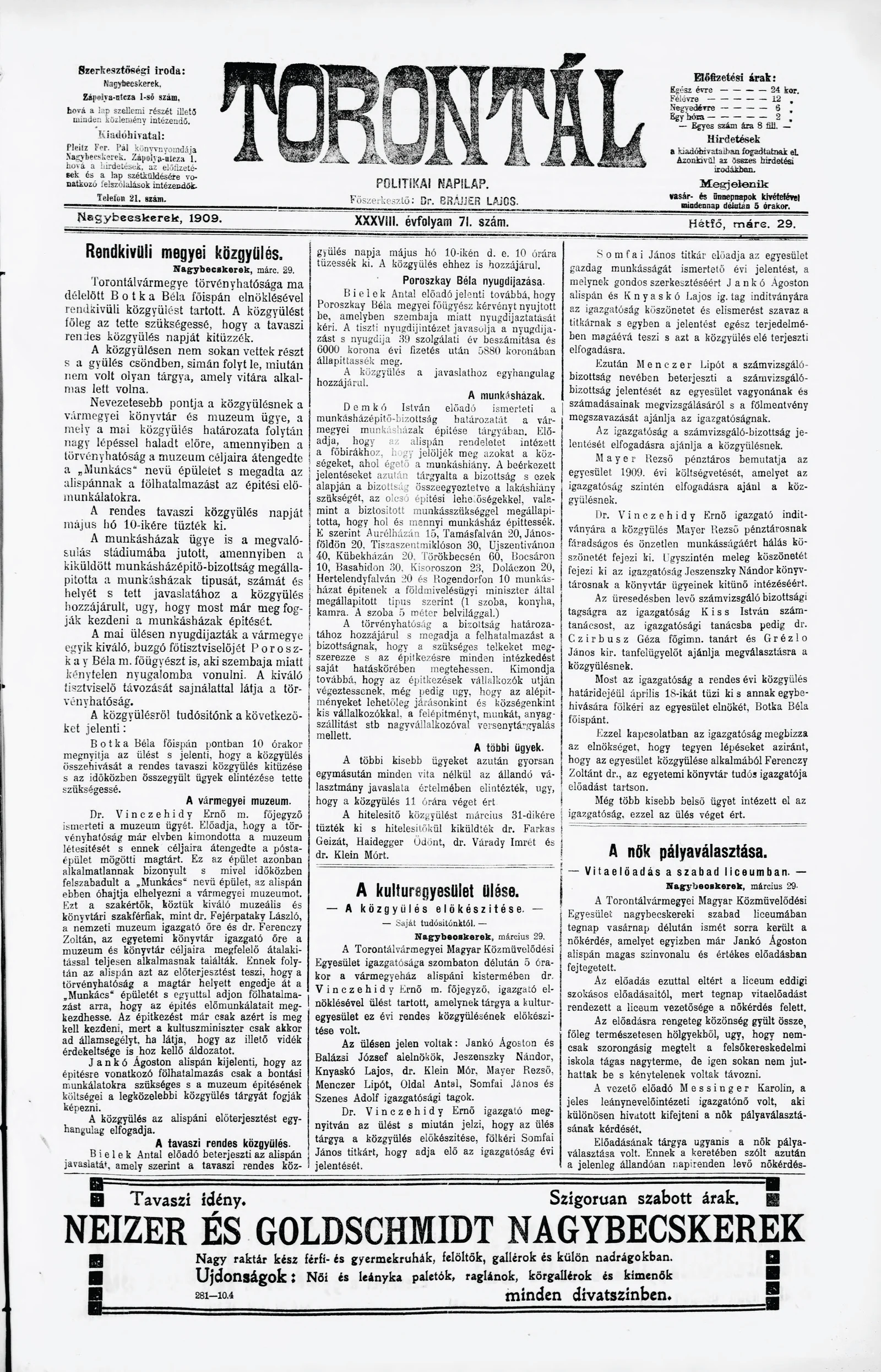 Torontál, 38. évf. 1909. március 29. 71. sz.