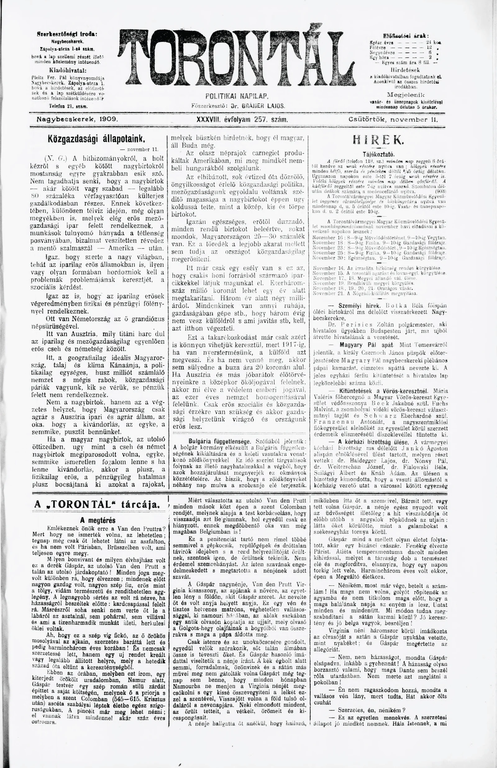 Torontál, 38. évf. 1909. november 11. 257. sz.