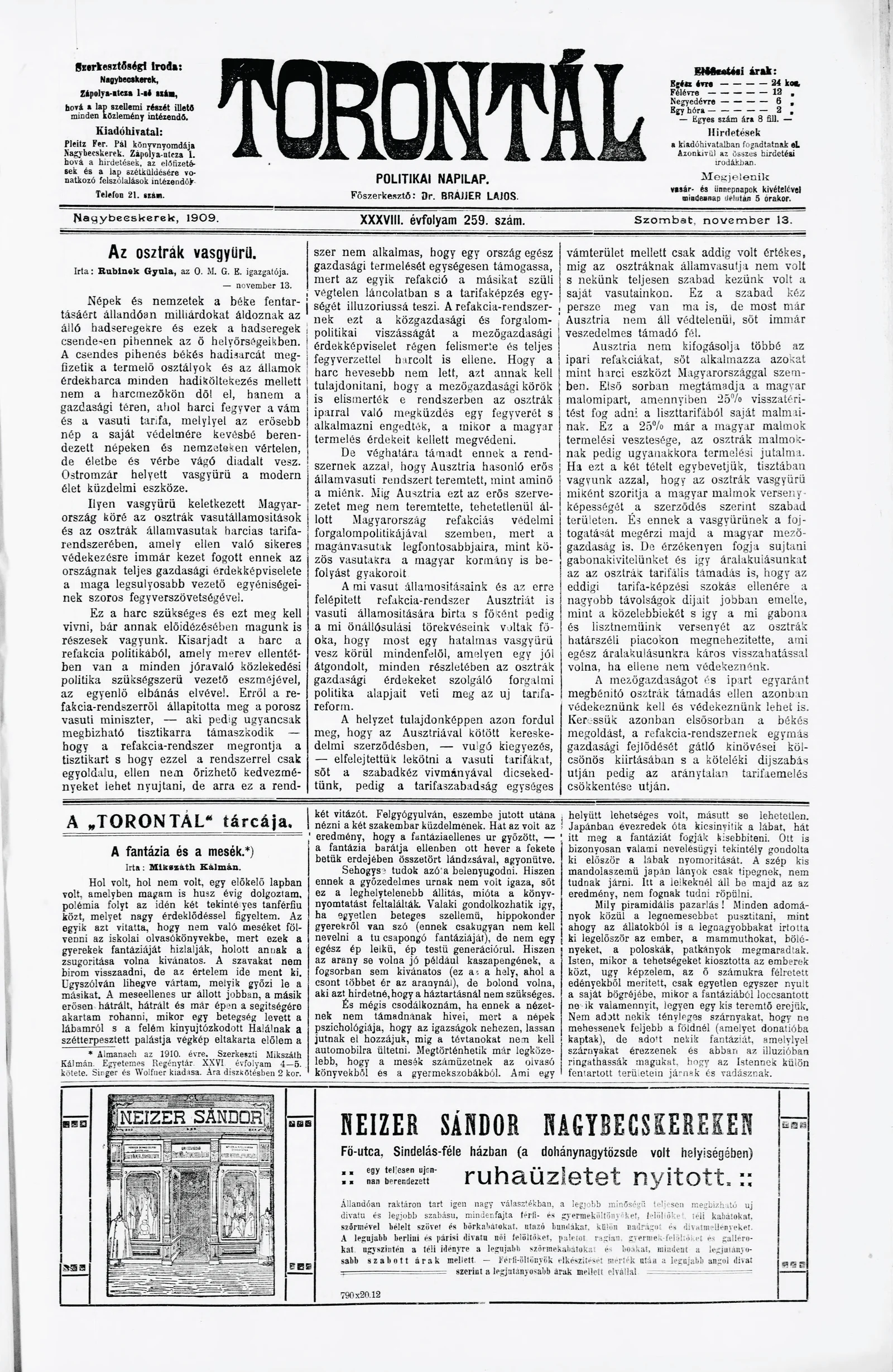 Torontál, 38. évf. 1909. november 13. 259. sz.