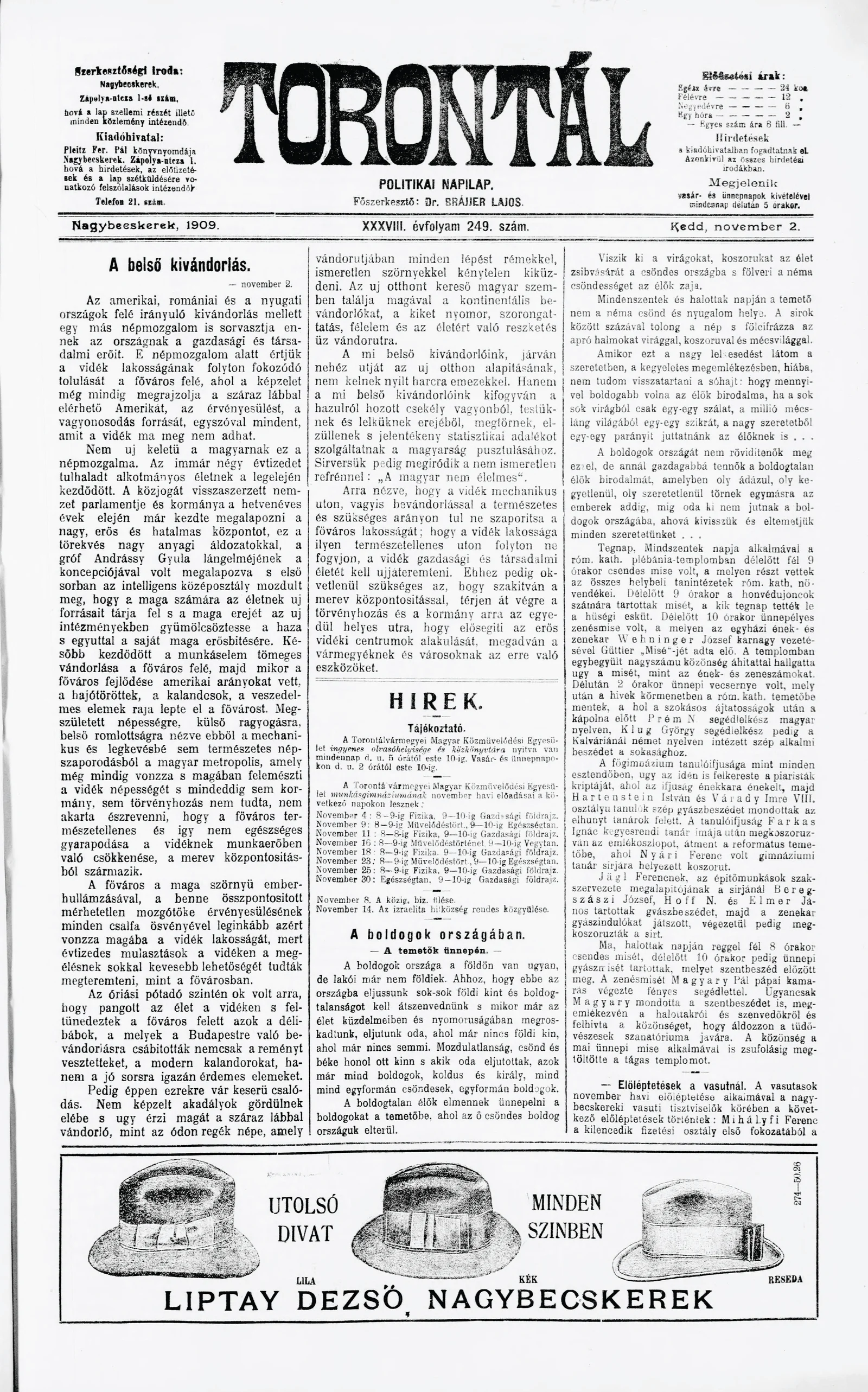 Torontál, 38. évf. 1909. november 2. 249. sz.