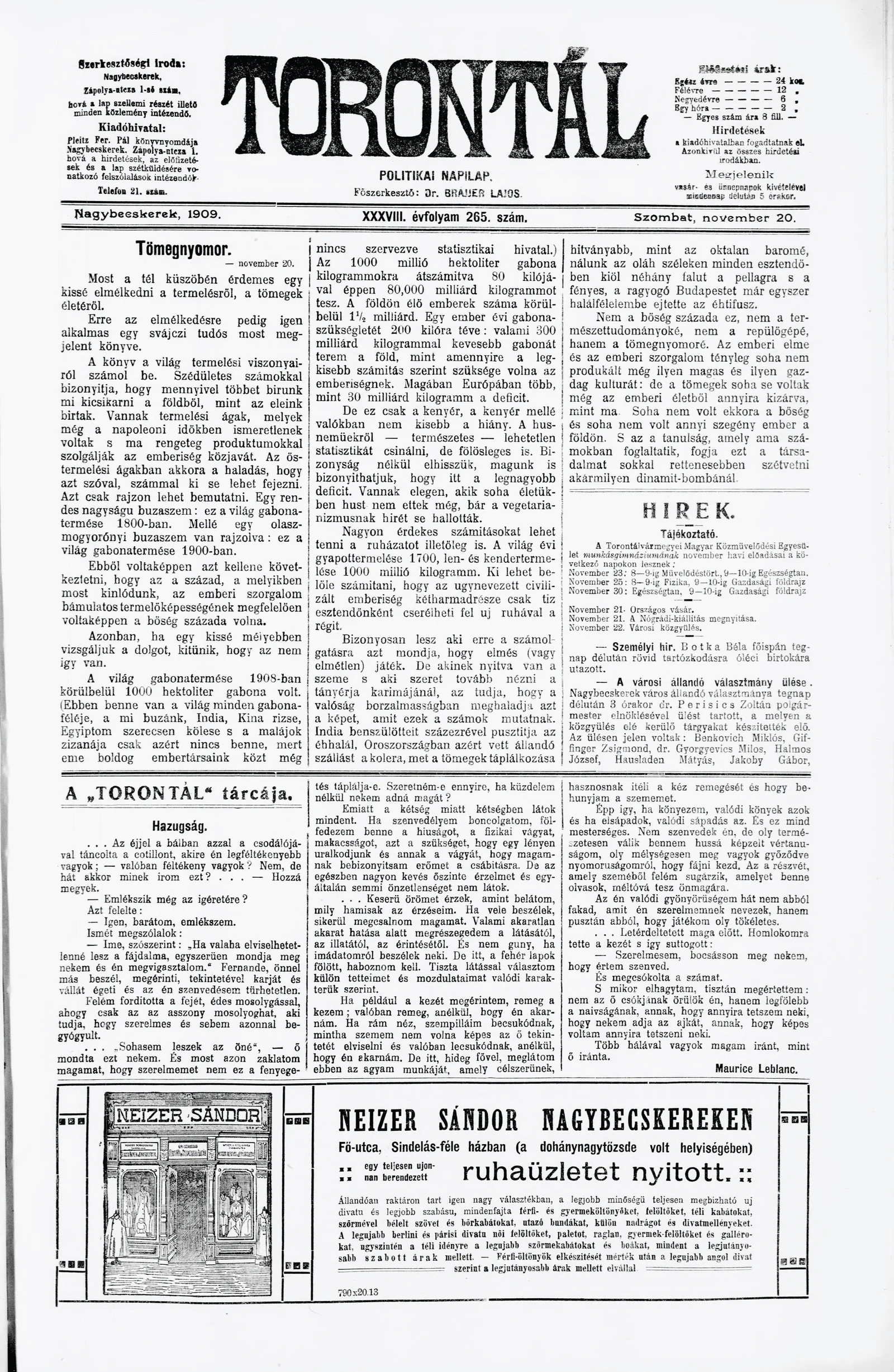 Torontál, 38. évf. 1909. november 20. 265. sz.