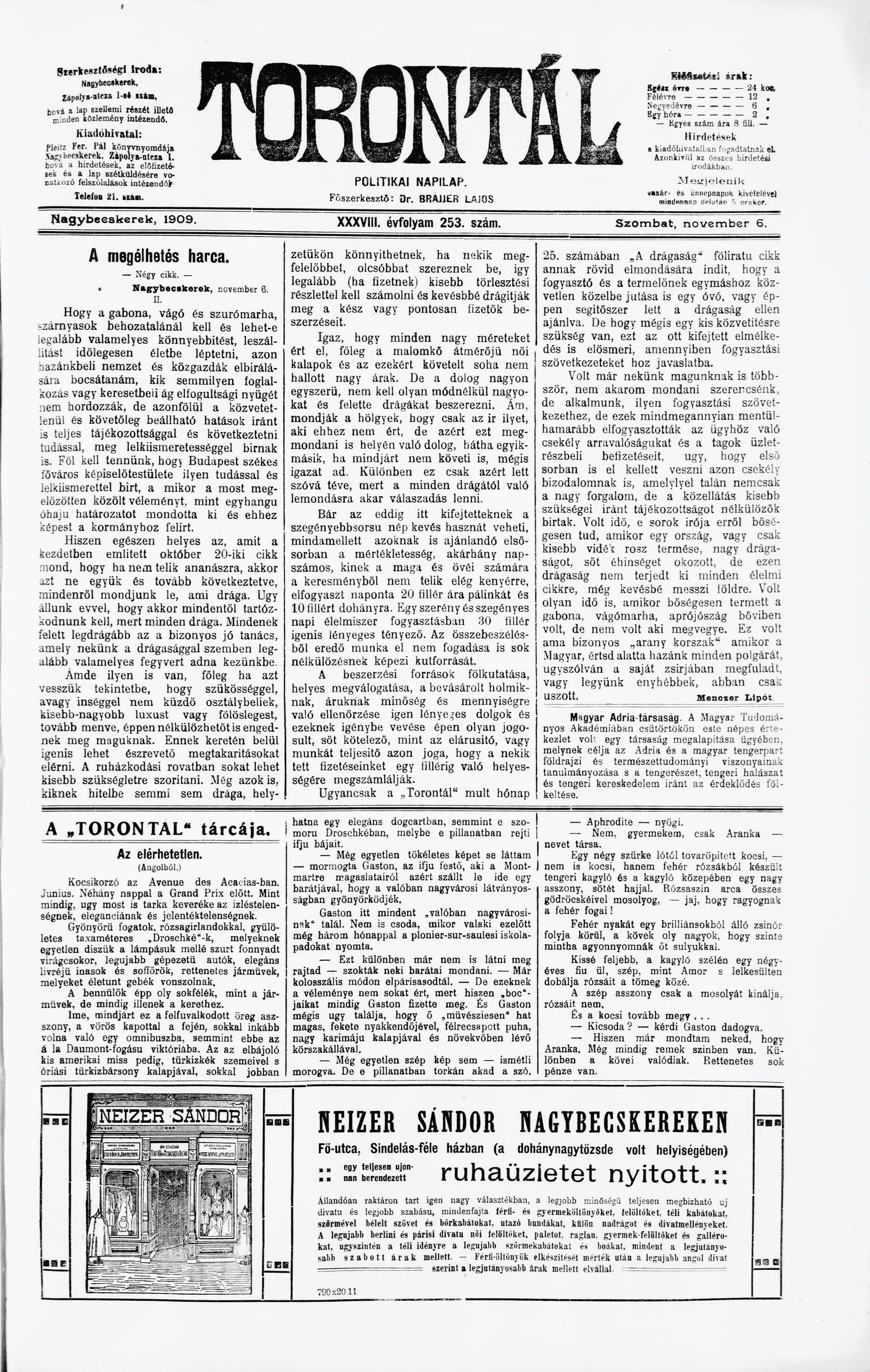 Torontál, 38. évf. 1909. november 6. 253. sz.