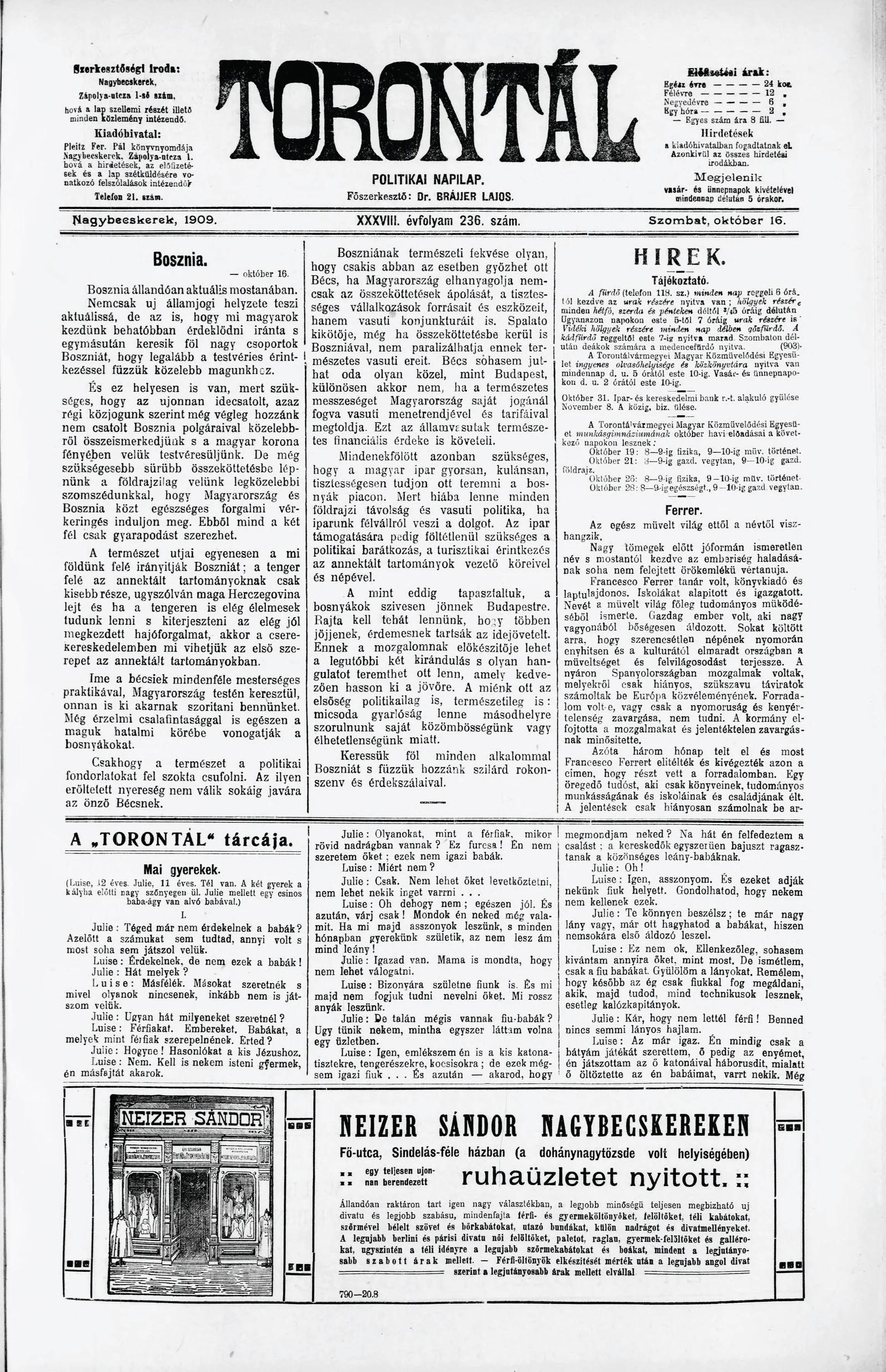 Torontál, 38. évf. 1909. október 16. 236. sz.