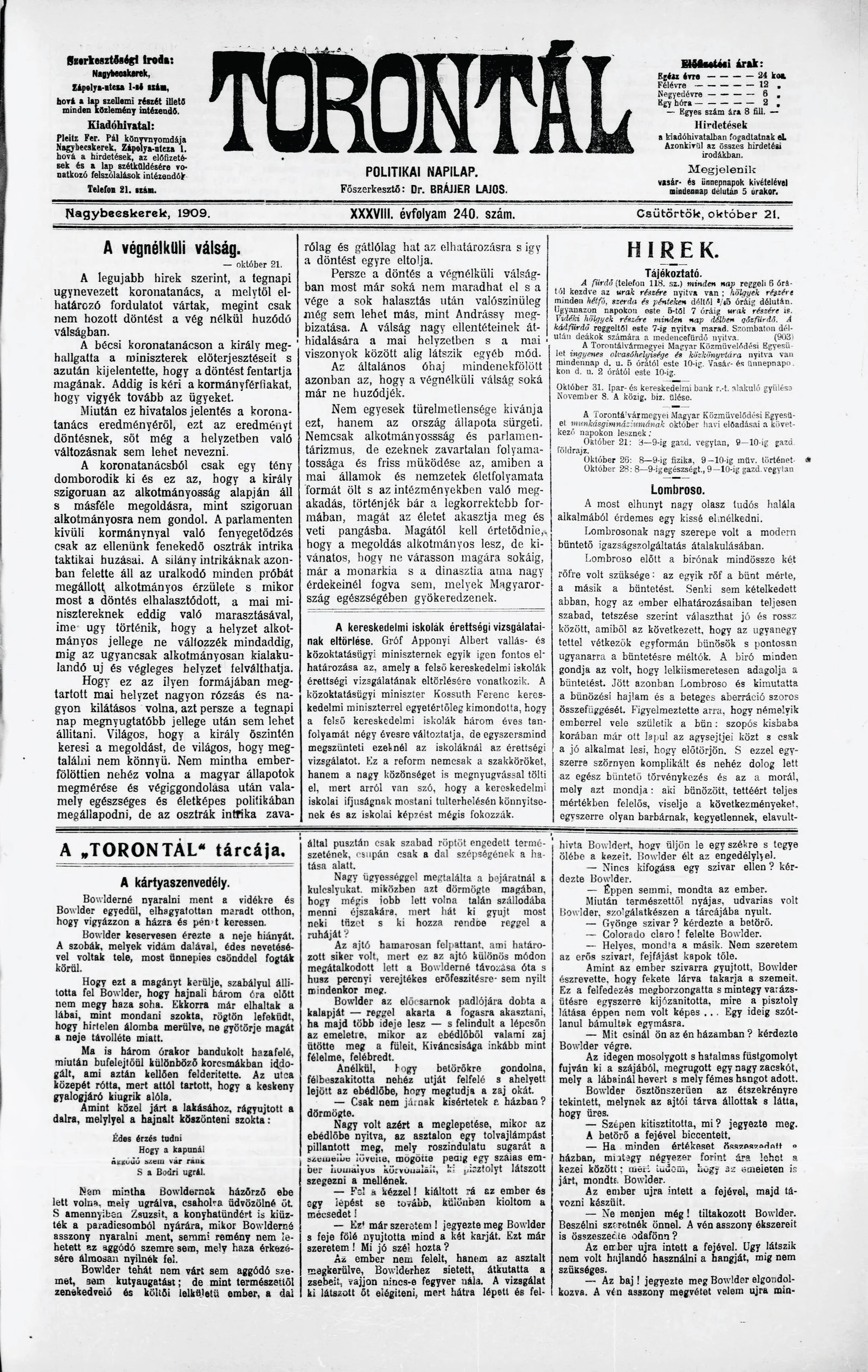 Torontál, 38. évf. 1909. október 21. 240. sz.