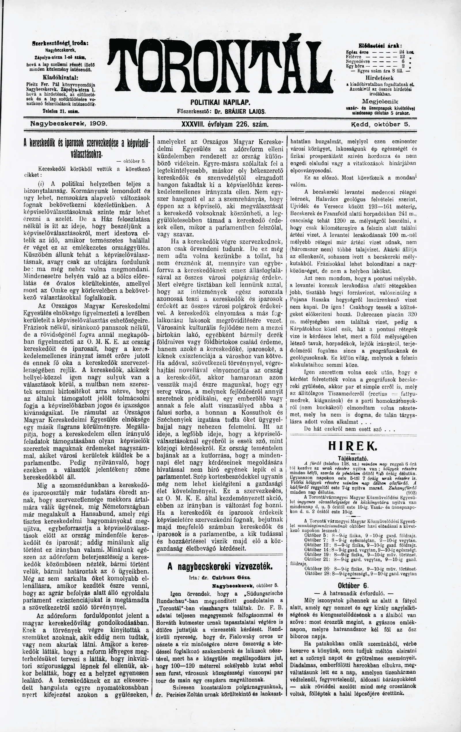 Torontál, 38. évf. 1909. október 5. 226. sz.