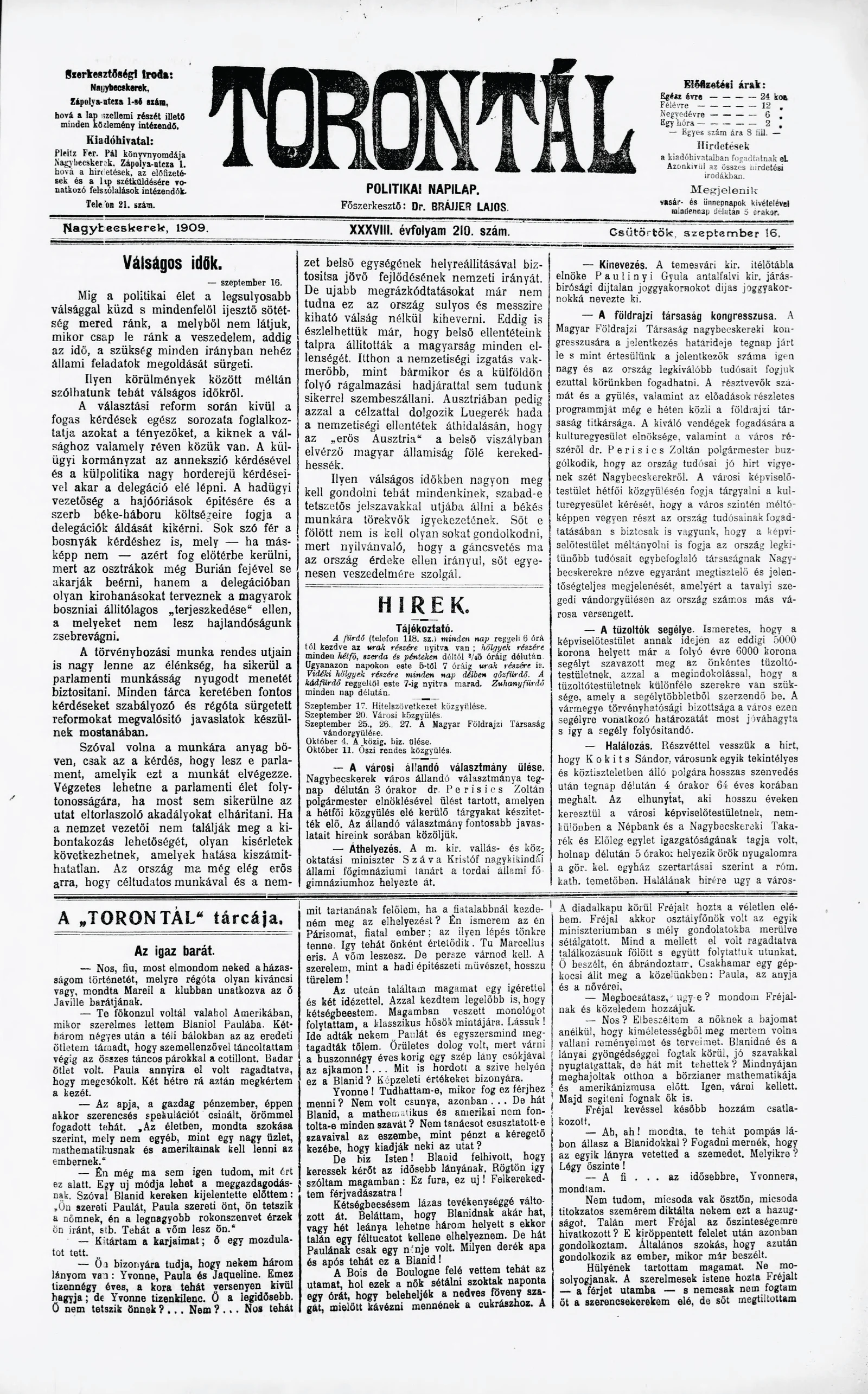 Torontál, 38. évf. 1909. szeptember 16. 210. sz.
