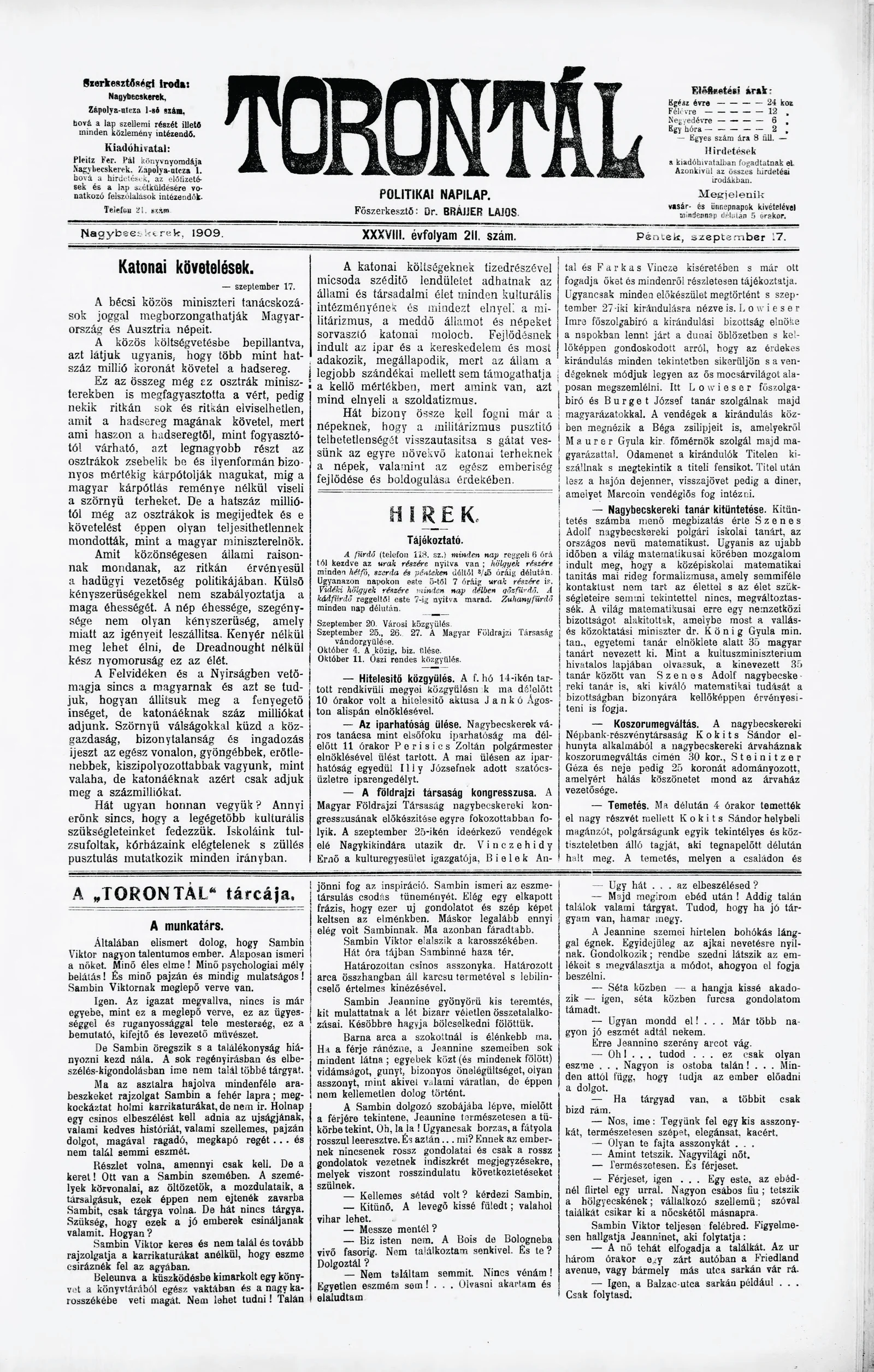 Torontál, 38. évf. 1909. szeptember 17. 211. sz.