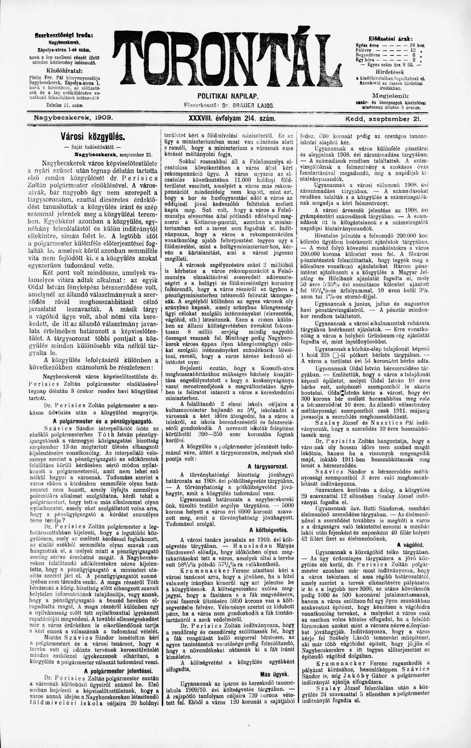 Torontál, 38. évf. 1909. szeptember 21. 214. sz.
