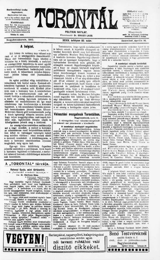 Torontál, 39. évf. 1910. április 16. 86. sz.