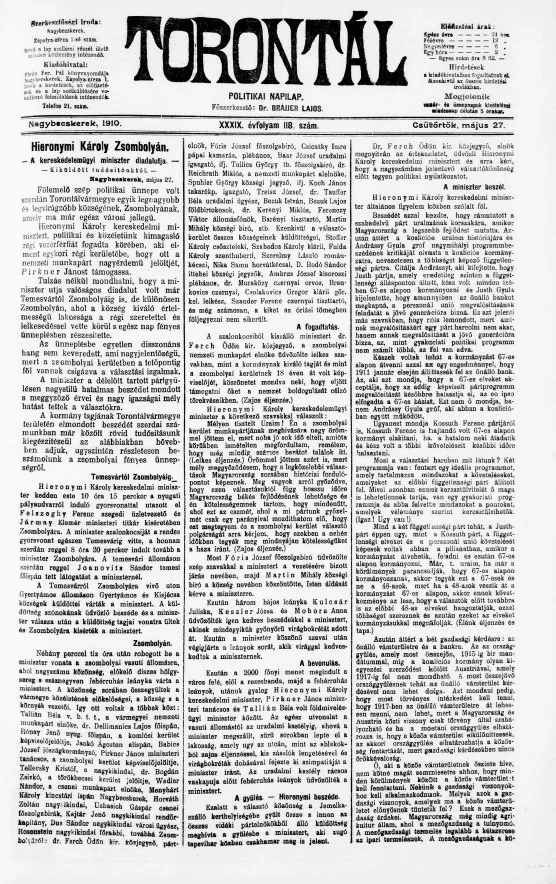 Torontál, 39. évf. 1910. május 27. 118. sz.