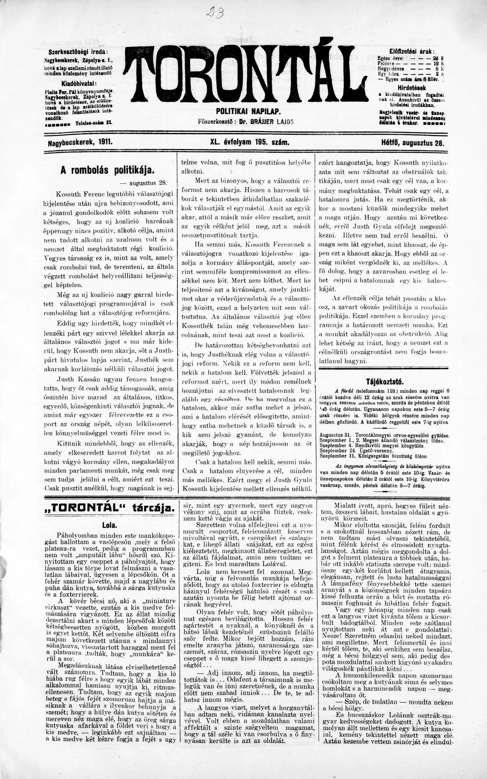 Torontál, 40. évf. 1911. augusztus 28. 195. sz.