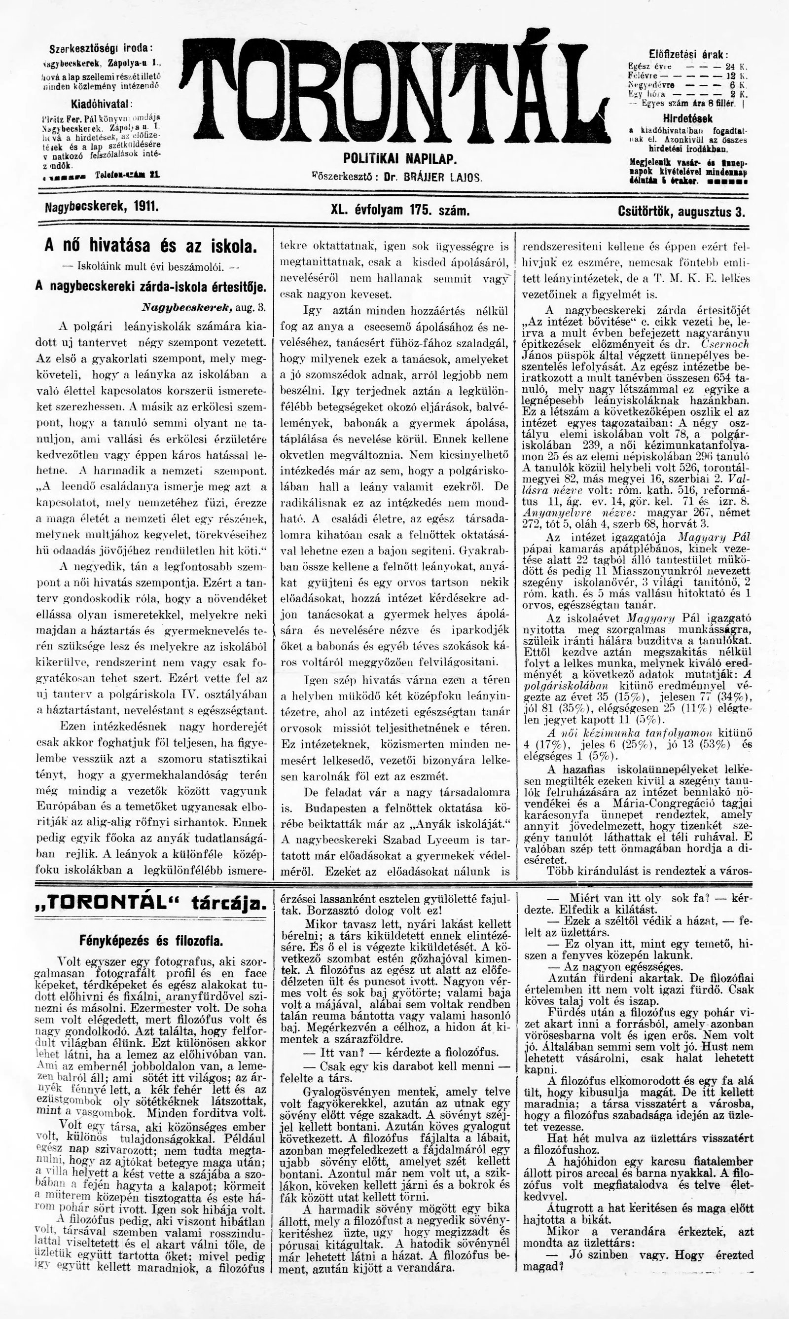 Torontál, 40. évf. 1911. augusztus 3. 175. sz.