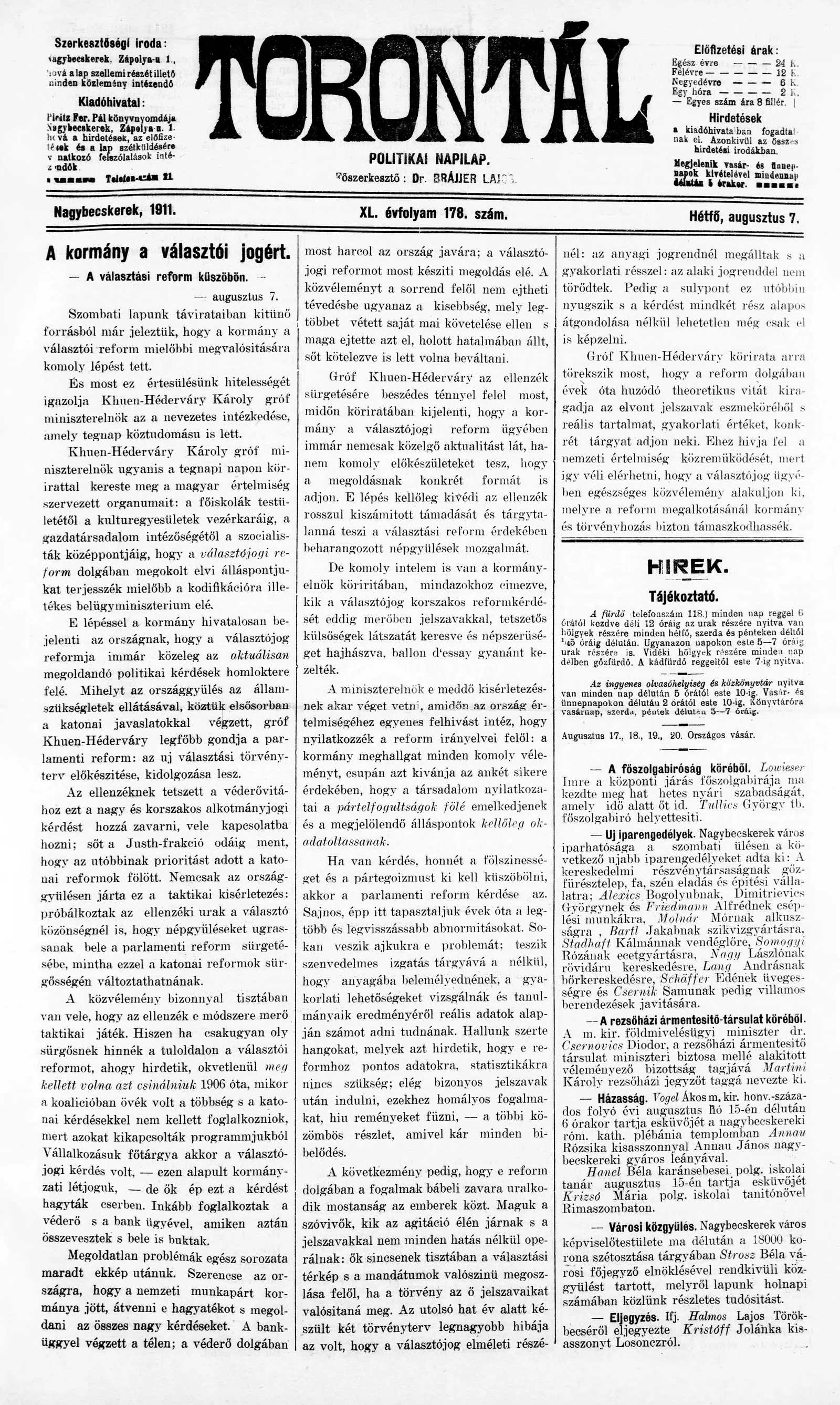 Torontál, 40. évf. 1911. augusztus 7. 178. sz.