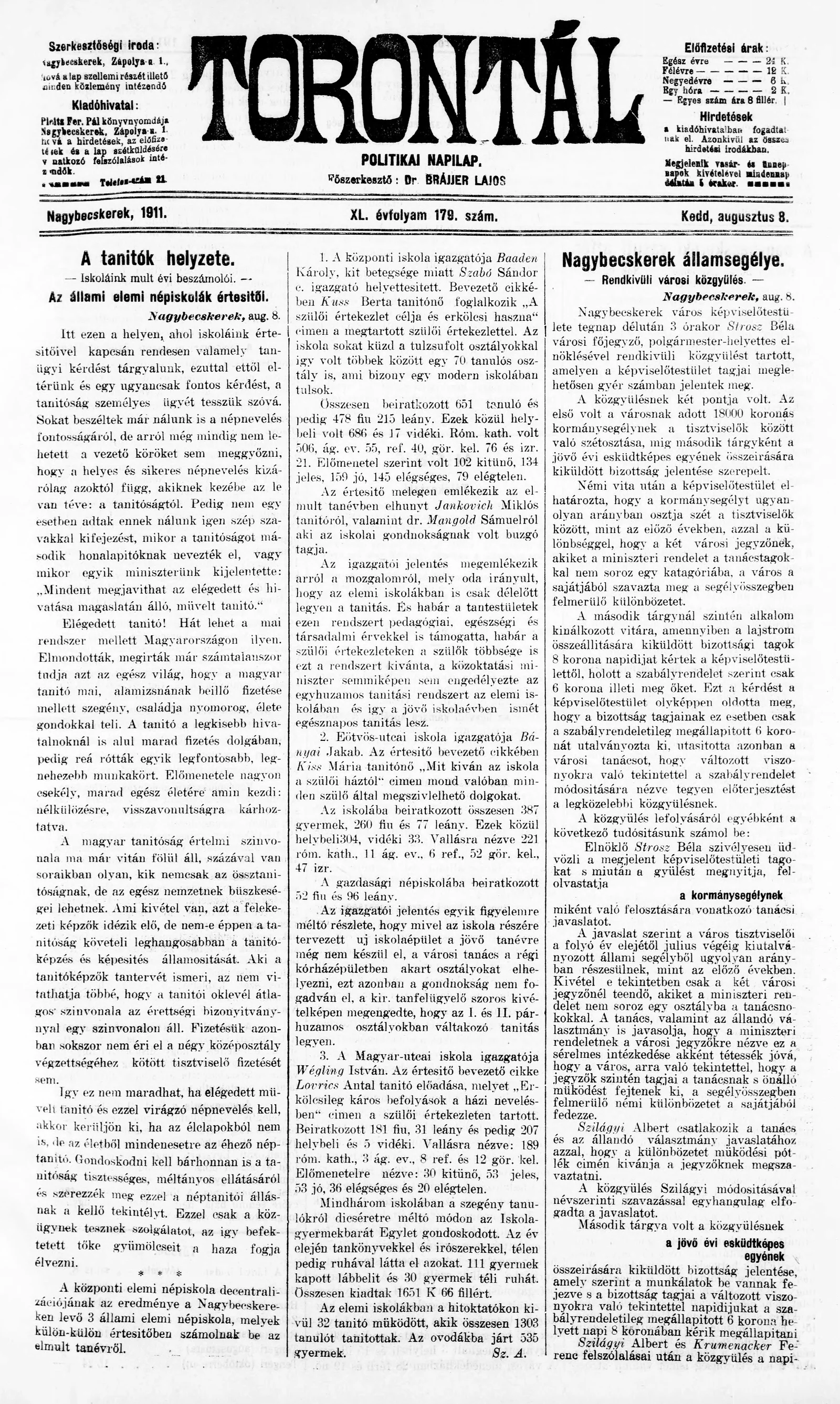 Torontál, 40. évf. 1911. augusztus 8. 179. sz.