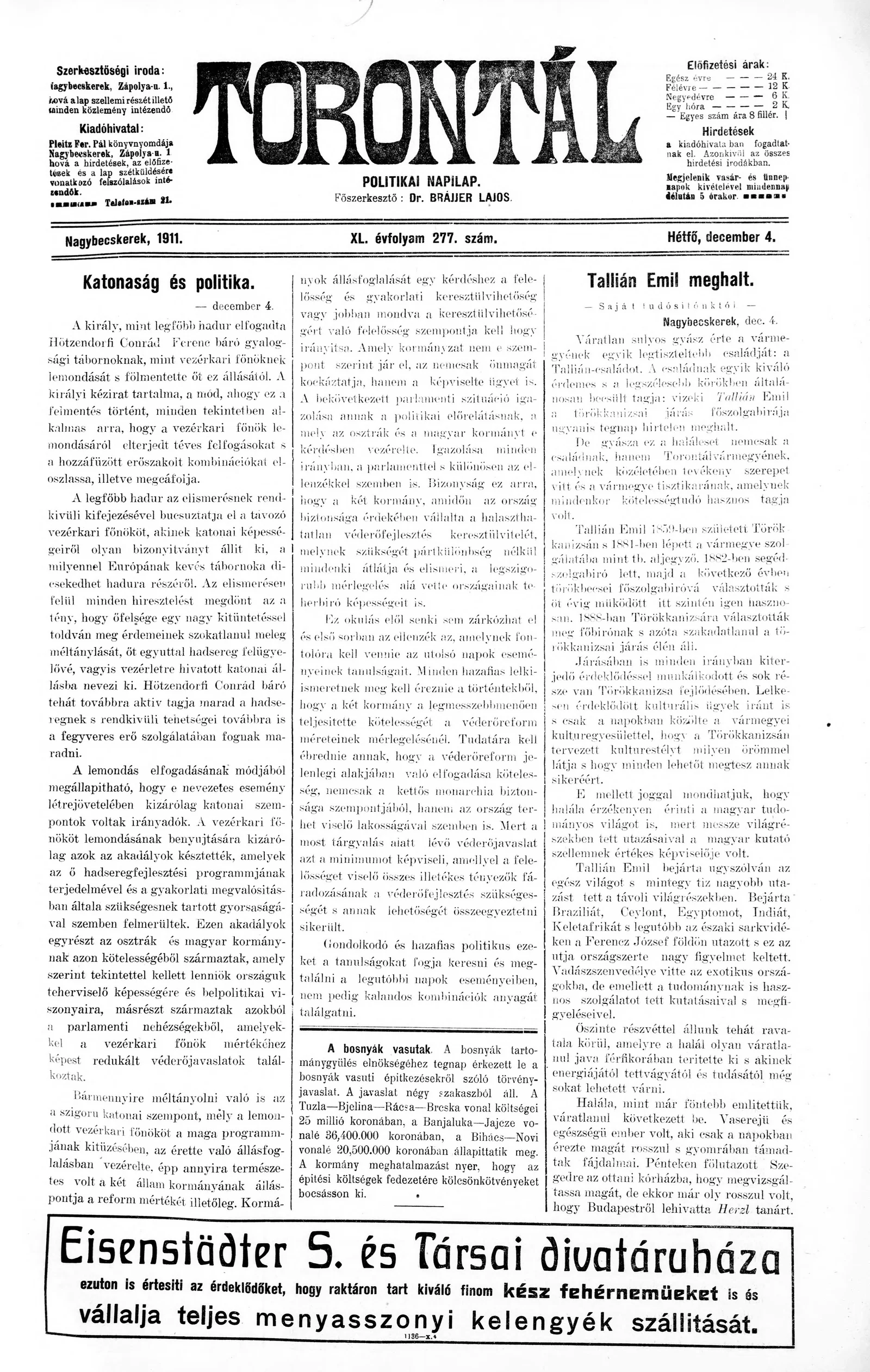 Torontál, 40. évf. 1911. december 4. 277. sz.