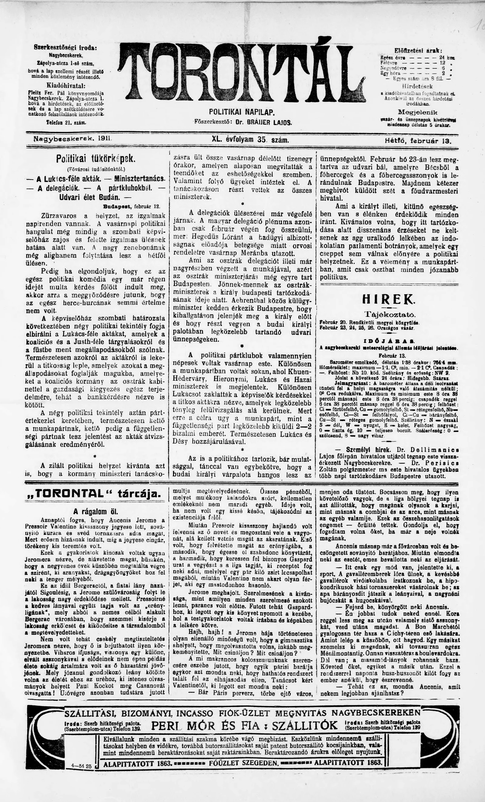 Torontál, 40. évf. 1911. február 13. 35. sz.