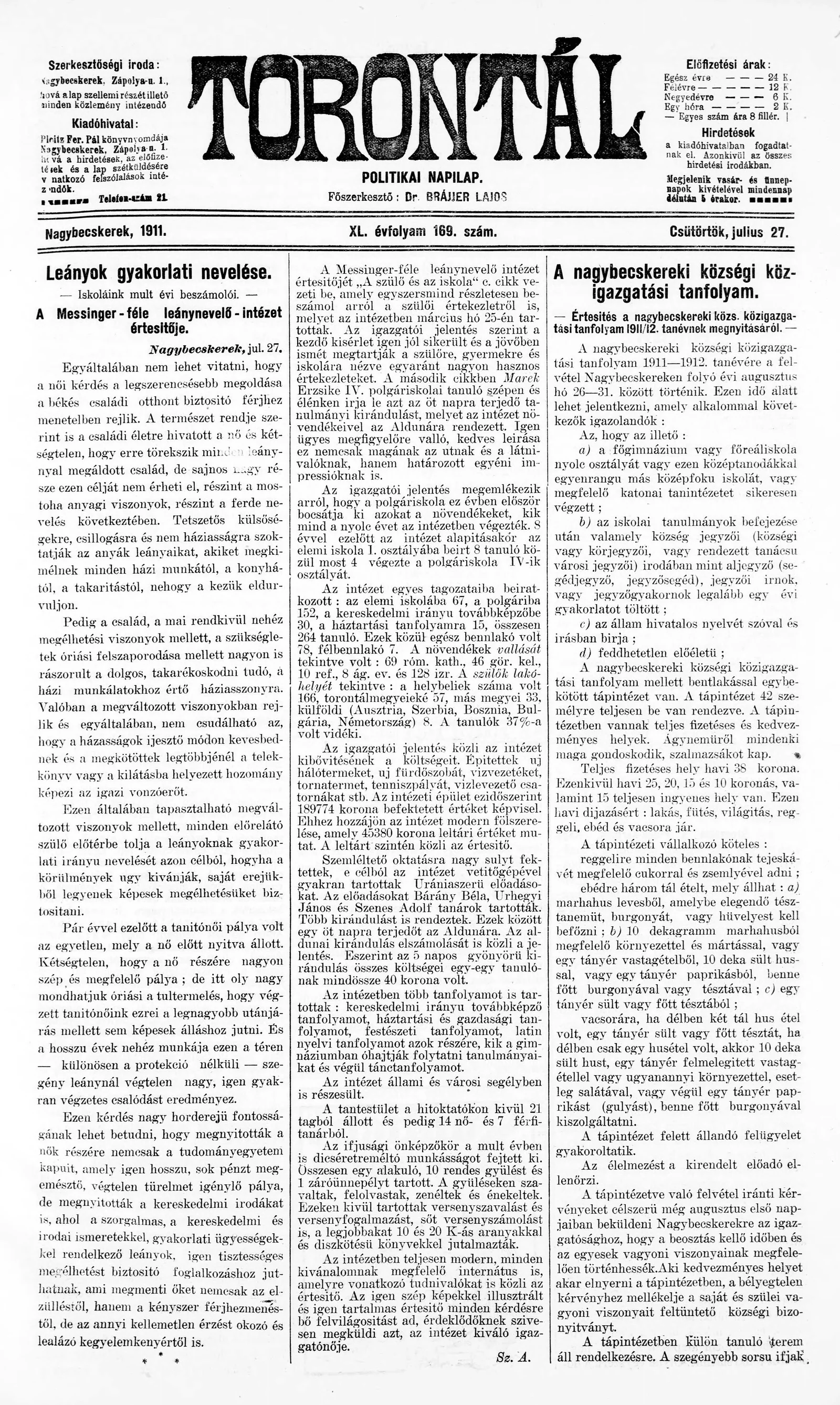 Torontál, 40. évf. 1911. július 27. 169. sz.