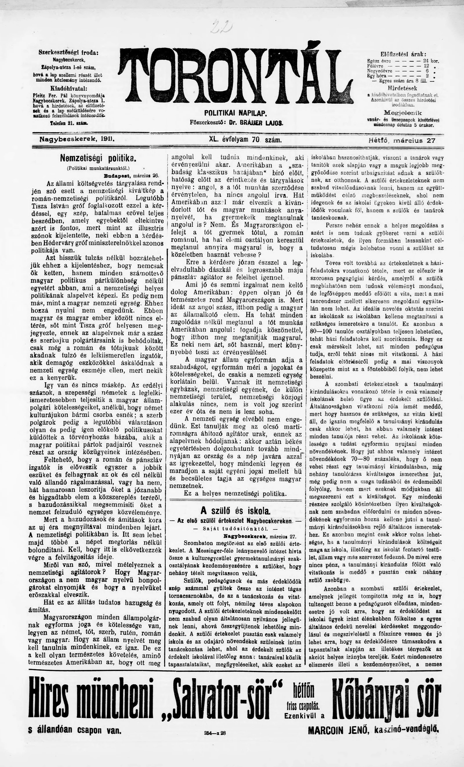 Torontál, 40. évf. 1911. március 27. 70. sz.