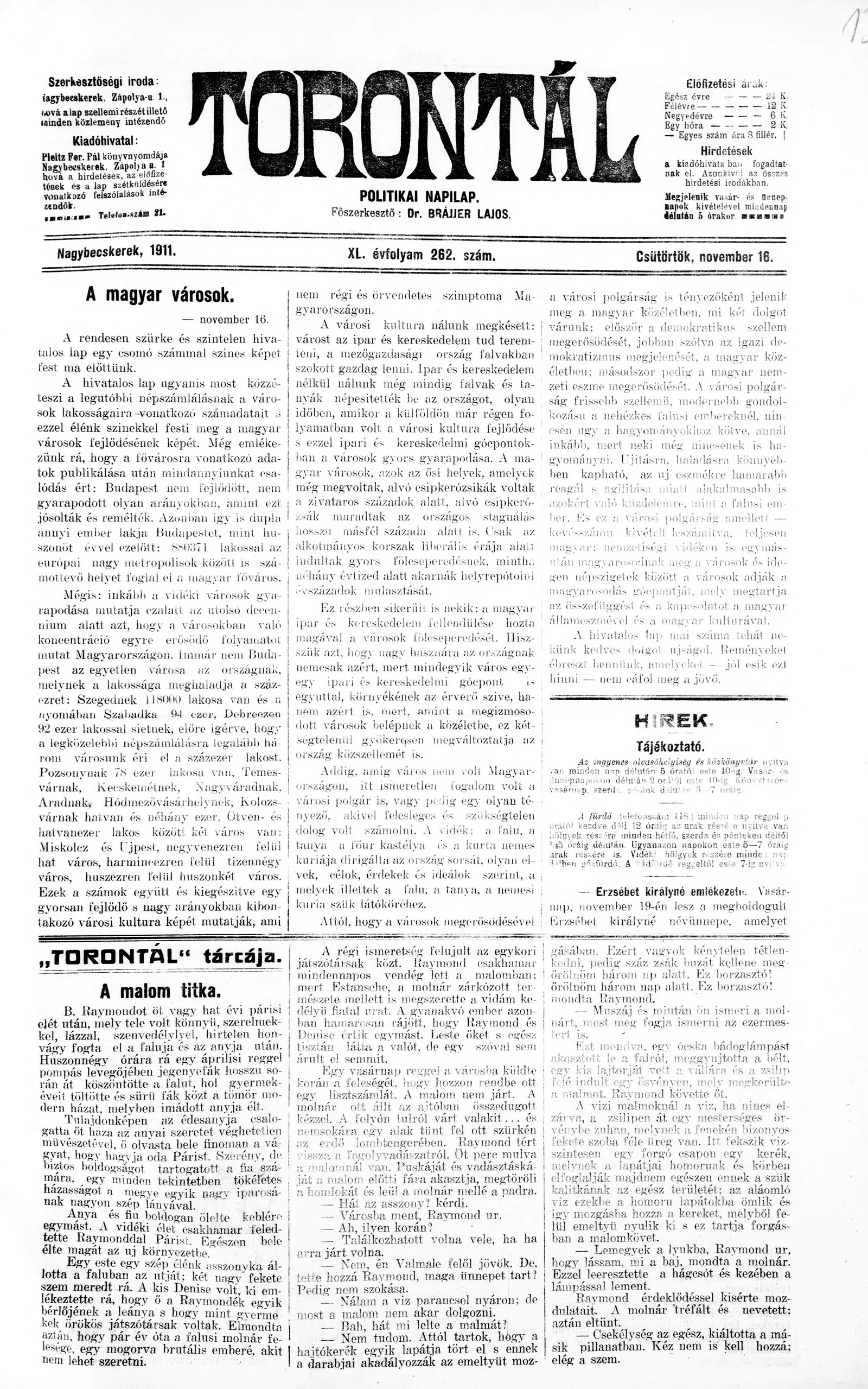 Torontál, 40. évf. 1911. november 16. 262. sz.