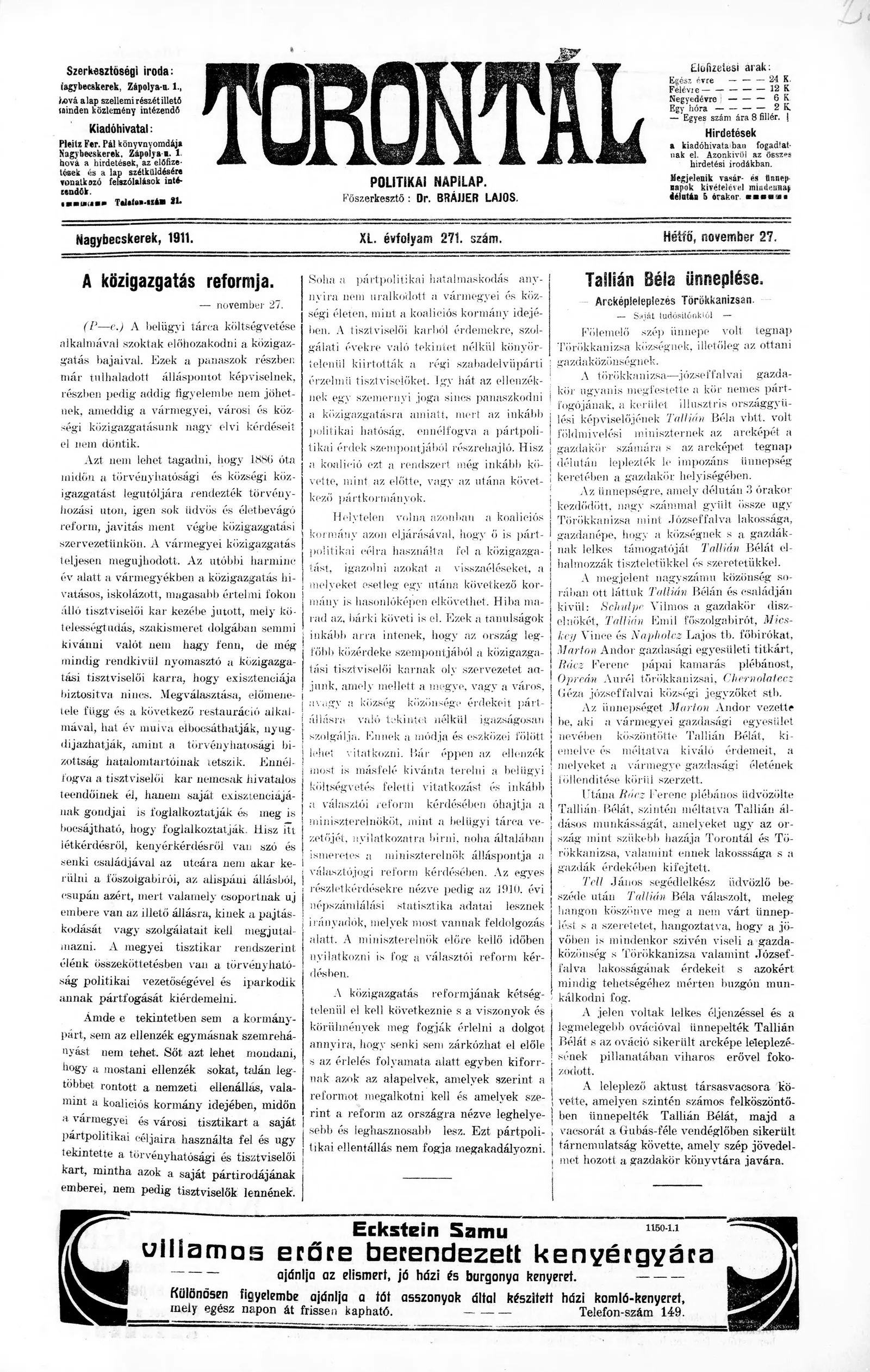 Torontál, 40. évf. 1911. november 27. 271. sz.